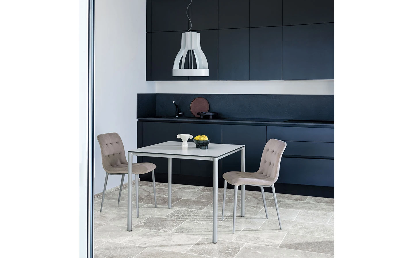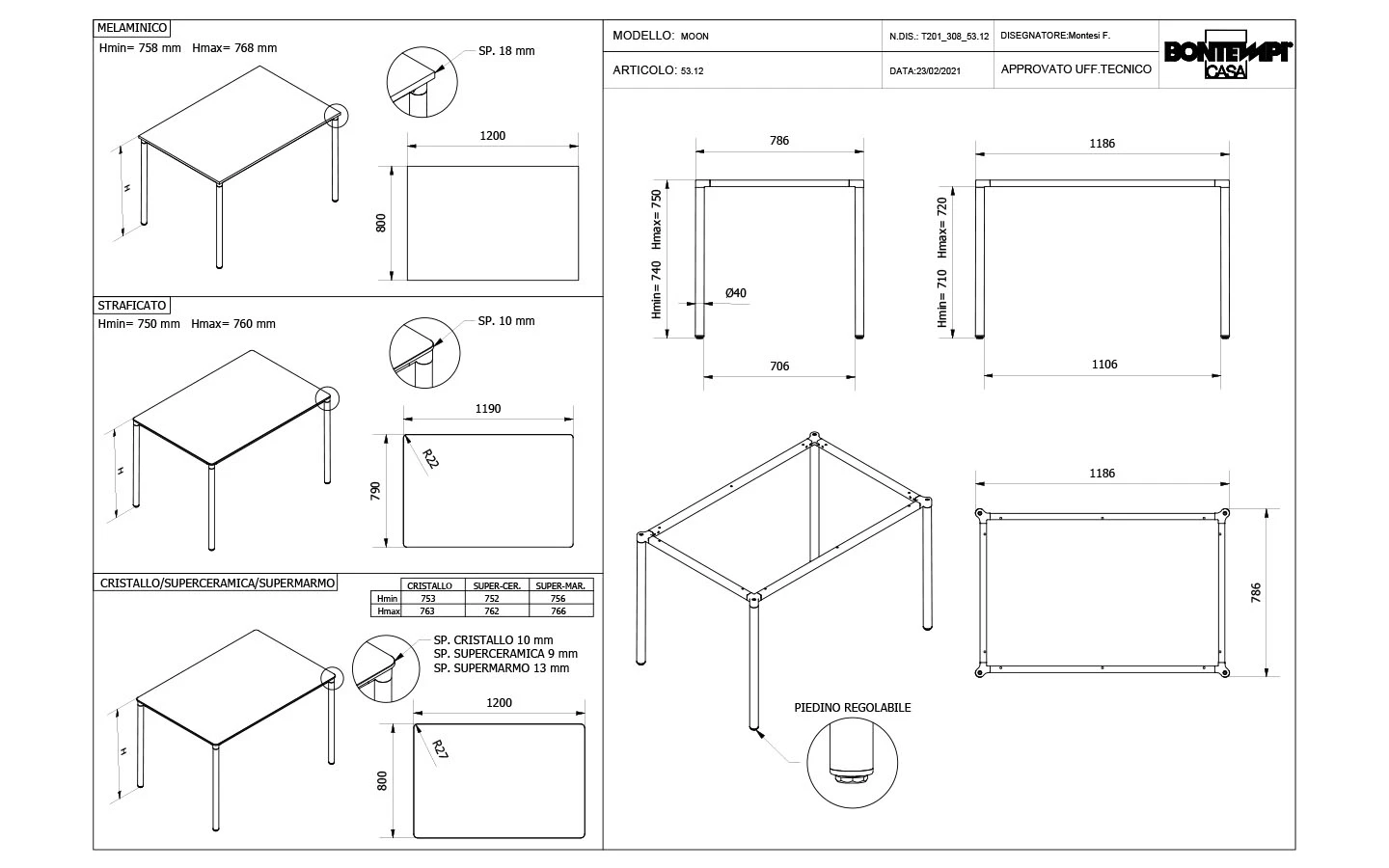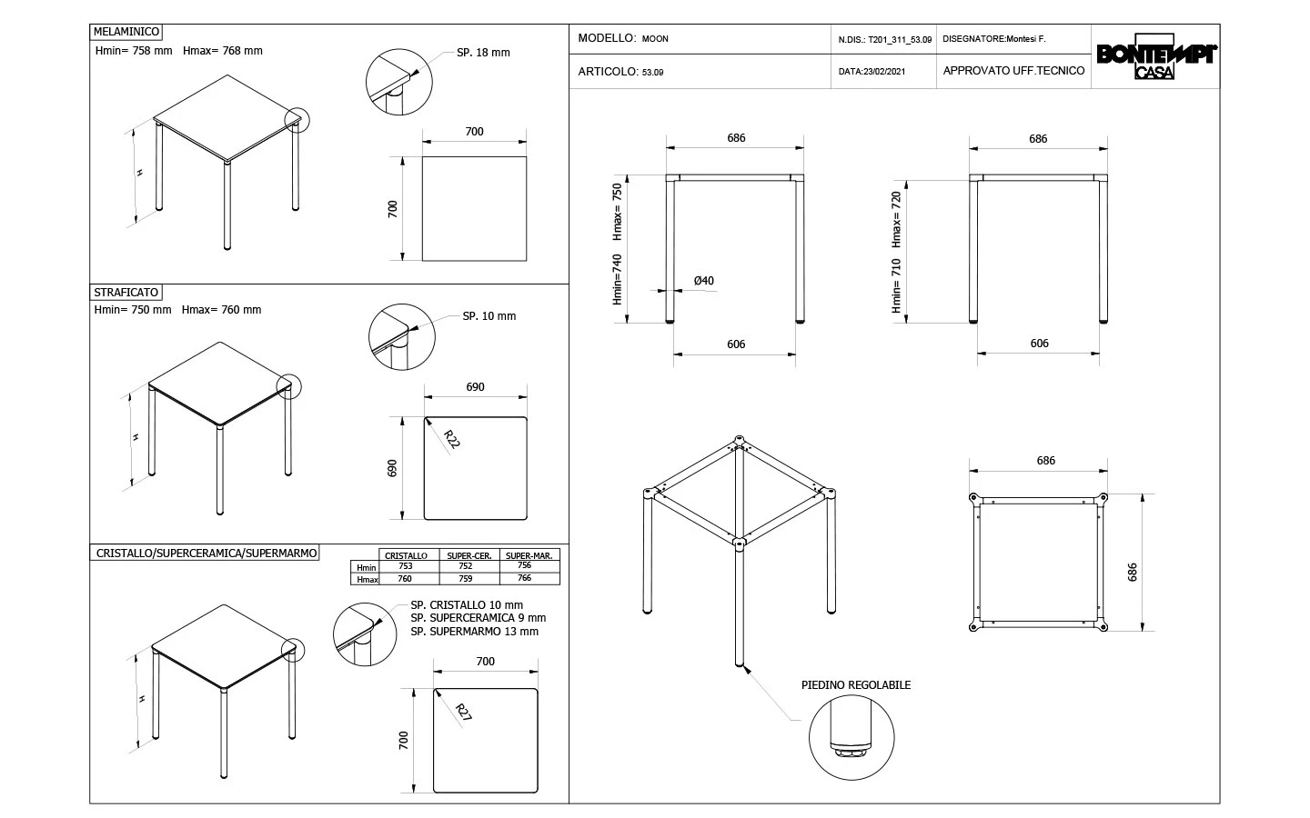 MOON е италианска трапезарна маса от колекцията на италианския производител Bontempi Casa. Плотът на масата може да бъде изработен от меламин, ламинат, лъскаво стъкло, матово стъкло с покритие против надраскване или керамика – материал и финиш по избор. Масата се предлага с правоъгълна и квадратна форма на плота. Основата е изработена от метал – финиш по избор на клиента. Цената на масата се формира на база избора на размер, форма, материал и финиш на плота и финиш на основата.