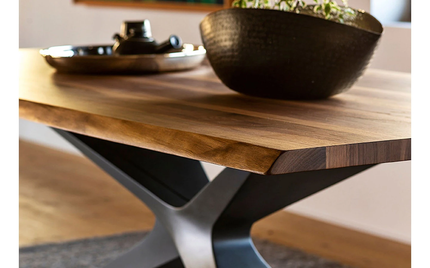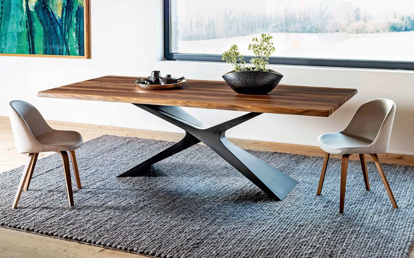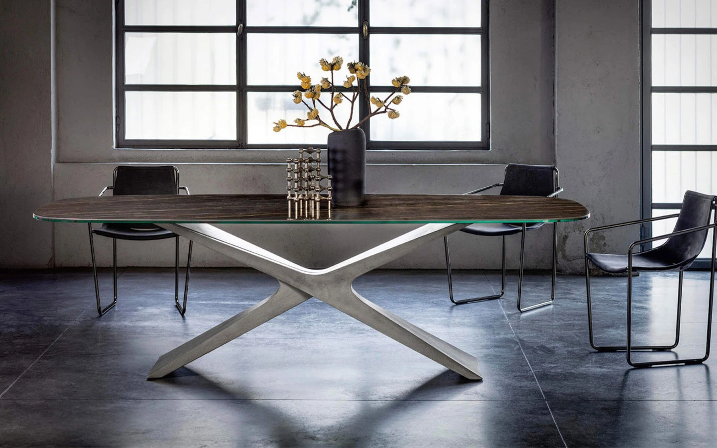 Масата NEXUS на италианския производител MIDJ, проектирана от Andrea Lucatello, е впечатляващ пример за съвременен италиански дизайн с изразена скулптурна идентичност. Отличава се със силно архитектурна основа, изработена от иновативния материал Baydur® – полимер, който позволява сложни органични форми и висока устойчивост. Основата наподобява преливаща се Х-форма, която съчетава стабилност с усещане за лекота и артистичност. Благодарение на централната си основа, масата предлага отлична функционалност и комфорт за седящите около нея. Без външни крака по ръбовете, тя осигурява повече свобода на движение и по-ефективно използване на пространството – особено при по-големи размери. NEXUS е маса, която се превръща в истински фокус в помещението. Нейният характерен силует и изтънчена комбинация от материали я правят идеален избор за представителна трапезария, дизайнерски офис или модерен ресторант. Това не е просто мебел, а артистично изявление – създадено с прецизност, страст и типичния италиански усет за естетика и баланс.