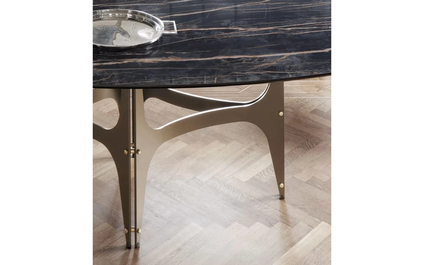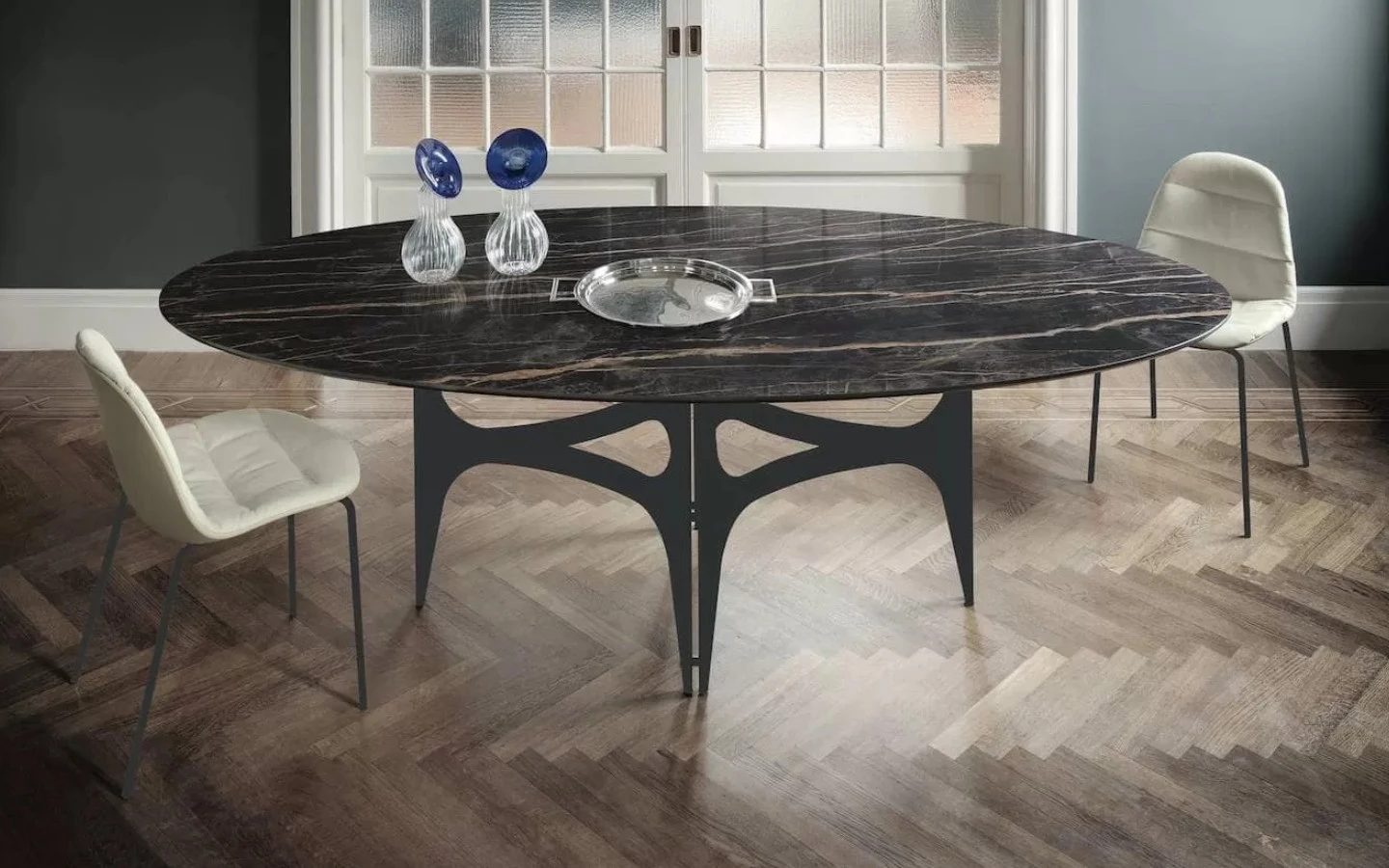UNIVERSE ELLIPTICAL е италианска трапезарна маса от колекцията на италианския производител Bontempi Casa. Плотът на масата може да бъде изработен от фурнировано дърво, естествен мрамор или керамика – материал и финиш по избор. Основата е изработена от метал – финиш по избор на клиента. Цената на масата се формира на база избора на размер, материал и финиш на плота и финиш на основата.