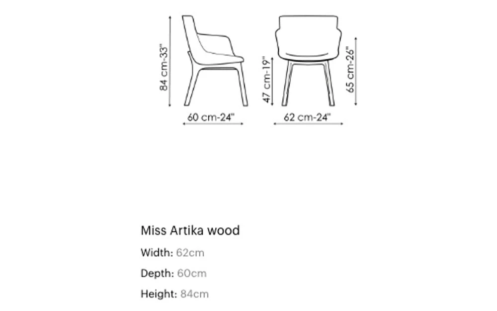 MISS ARTIKA WOOD е италиански трапезарен стол с подлакътници от колекцията на италианския производител Bonaldo. Италианският трапезарен стол MISS ARTIKA WOOD може да бъде тапициран в дамаска, еко кожа или кожа – материал и цвят по избор на клиента. Краката на стола са от масивен ясен – финиш по избор на клиента. Заедно с MISS ARTIKA WOOD, се предлагат следните варианти: ARTIKA (с метални крака), ARTIKA SI (с метална основа във формата на шейна), ARTIKA COVERED (с изцяло тапицирани крака), ARTIKA WOOD (с дървена основа), MISS ARTIKA (с подлакътници и с метални крака), MISS ARTIKA COVERED (с подлакътници и с изцяло тапицирани крака) и MISS ARTIKA SI (с подлакътници и с метална основа във формата на шейна). Към серията на трапезарния стол се предлагат също и варианти бар столове: ARTIKA TOO (с метални крака) и ARTIKA WOOD TOO (с дървени крака).