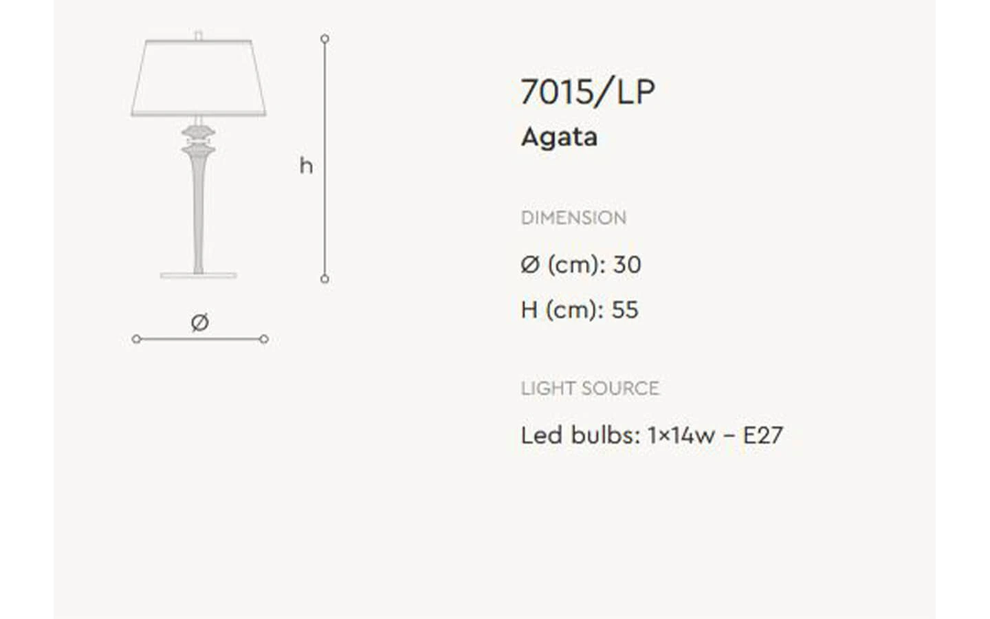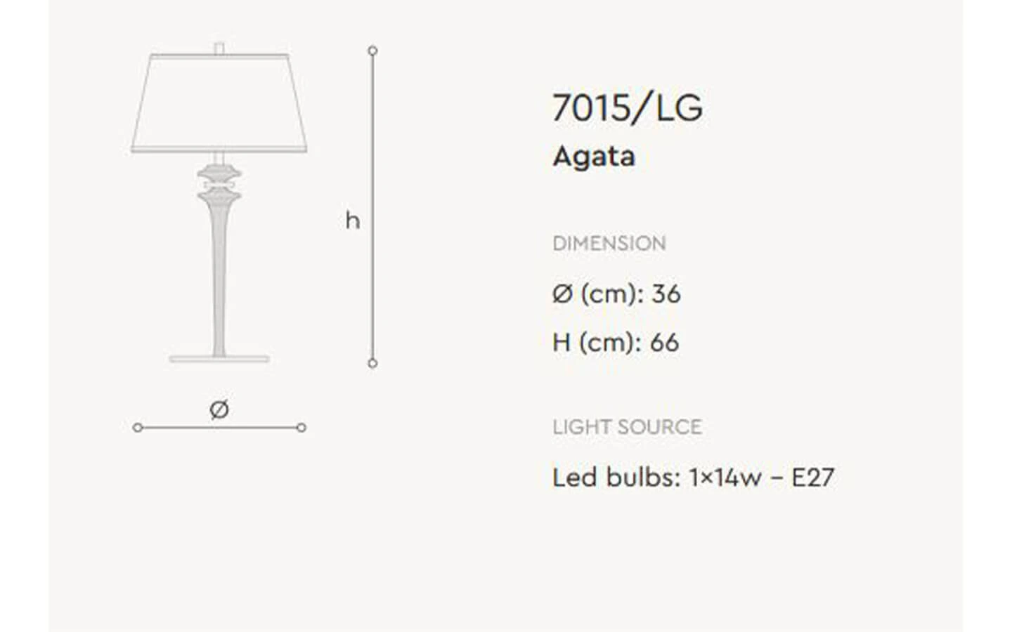 Настолната лампа AGATA на ITALAMP от колекция Generale е изящно осветително тяло, което съчетава класическа елегантност с модерно излъчване. Основата е изработена от метал и е допълнена с фини стъклени елементи, които придават мек блясък и усещане за лукс. Абажурът е от висококачествен плат в бял или черен цвят, който деликатно филтрира светлината и създава топла и уютна атмосфера. Лампата се предлага в два размера – с диаметър 30 см и височина 55 см или с диаметър 36 см и височина 66 см, което я прави подходяща както за по-малки, така и за по-просторни помещения. Работи с една крушка E27 и има възможност за димиране, което позволява регулиране на светлината според настроението и нуждите. AGATA е изработена в Италия с внимание към детайла и е идеален избор за интериори, в които се цени стил, финес и безупречно качество.
