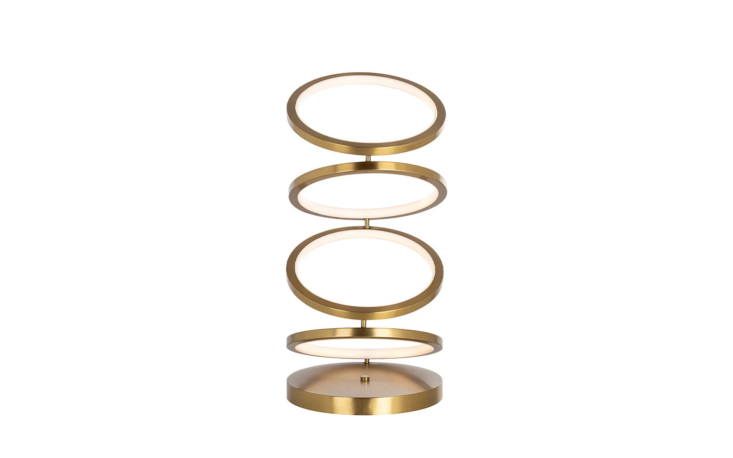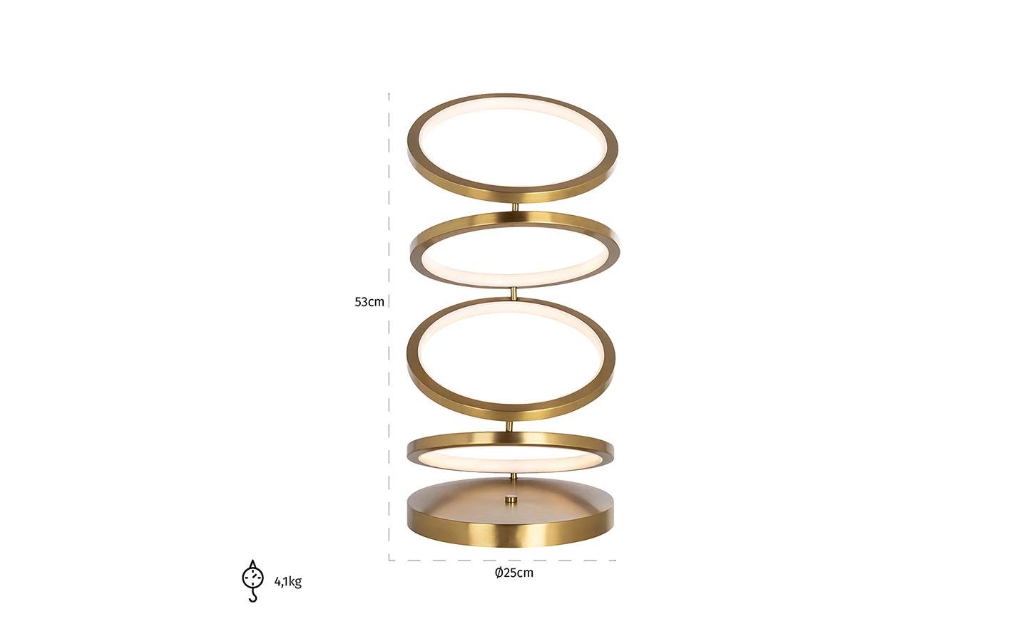 Настолната лампа JAIMIN от Richmond Interiors, е впечатляващо осветително тяло с модерен и артистичен дизайн. Със своята уникална конструкция от три златисти пръстена, тя придава динамика и стил на всяко пространство. Тази лампа е идеална за създаване на уютна атмосфера в дневната, спалнята или офиса. Нейният модерен дизайн и висококачествени материали я правят отличен избор за акцентно осветление.