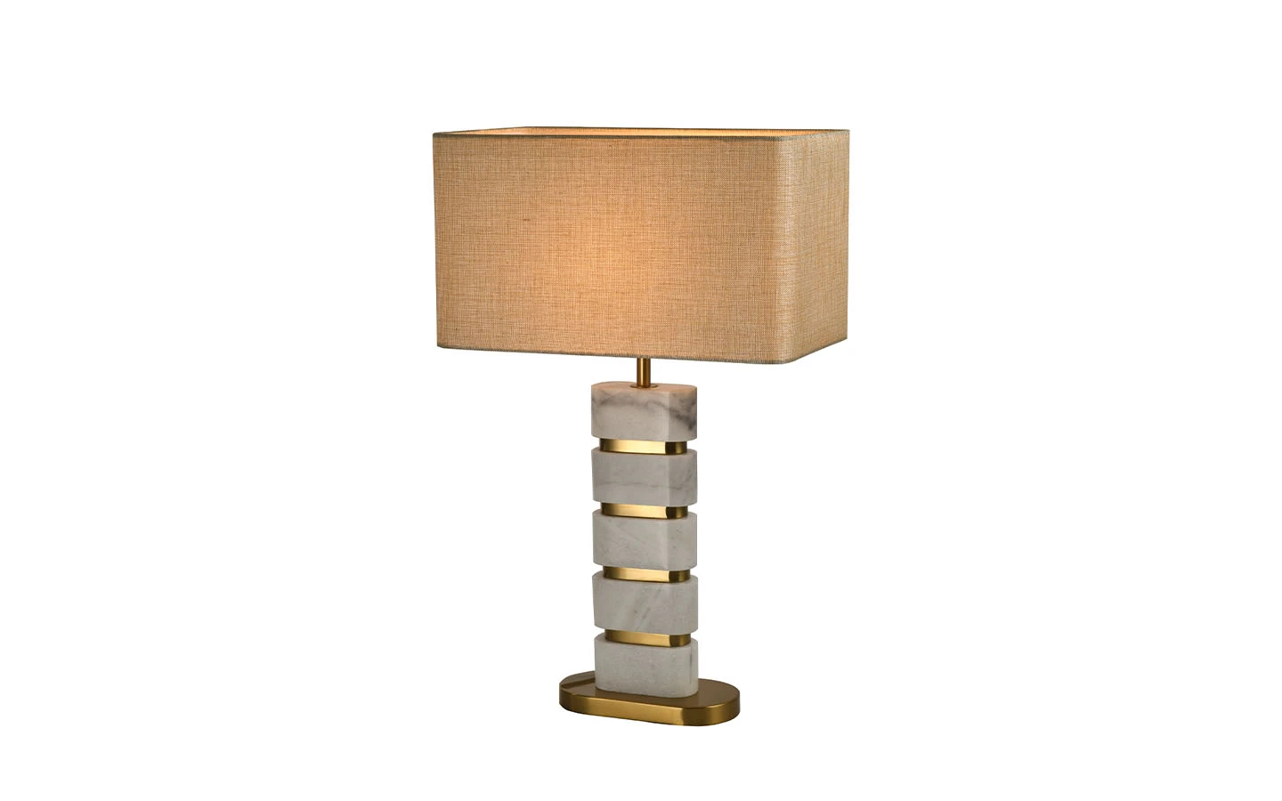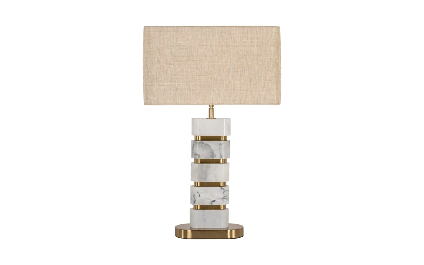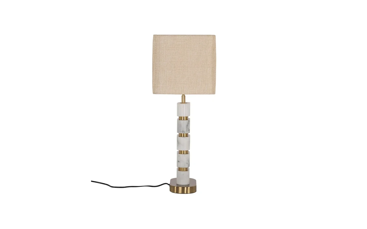 Настолната лампа LENORE от Richmond Interiors е елегантно осветително тяло, което съчетава луксозни материали и изискан дизайн, вдъхновен от Арт Деко стила. Тя е идеално допълнение към модерни и класически интериори, придавайки изтънченост и уют. Дизайнът на лампата включва основа от подредени бели мраморни блокове, разделени със златисти метални акценти, създавайки изтънчен вид. Неутралният текстилен абажур осигурява мека и разсеяна светлина, създавайки топла и приветлива атмосфера. Лампата LENORE е подходяща за използване върху бюра, помощни масички или нощни шкафчета, като съчетава функционалност и декоративен ефект.