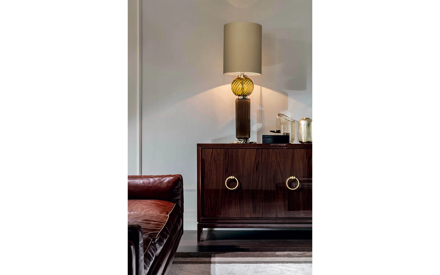 MATILDA е настолна лампа от колекцията на италианския производител Italamp. Структурата e изработена от метал – финиш Light Gold. Декоративните детайли са изработени от стъкло – финиши по избор. Абажурът е изработен от текстил – Hazelnut Ponge’.