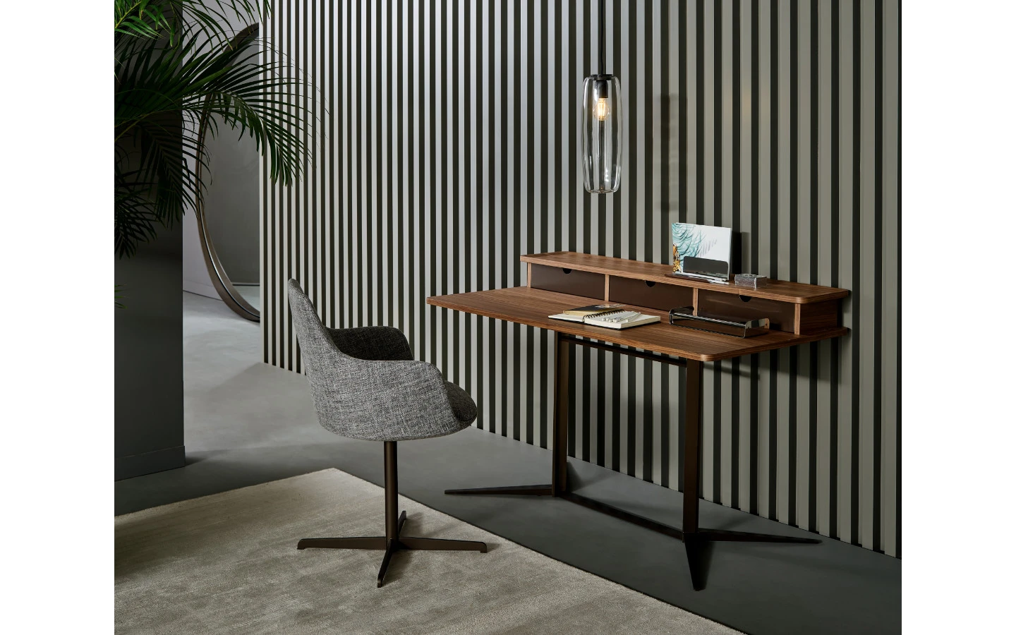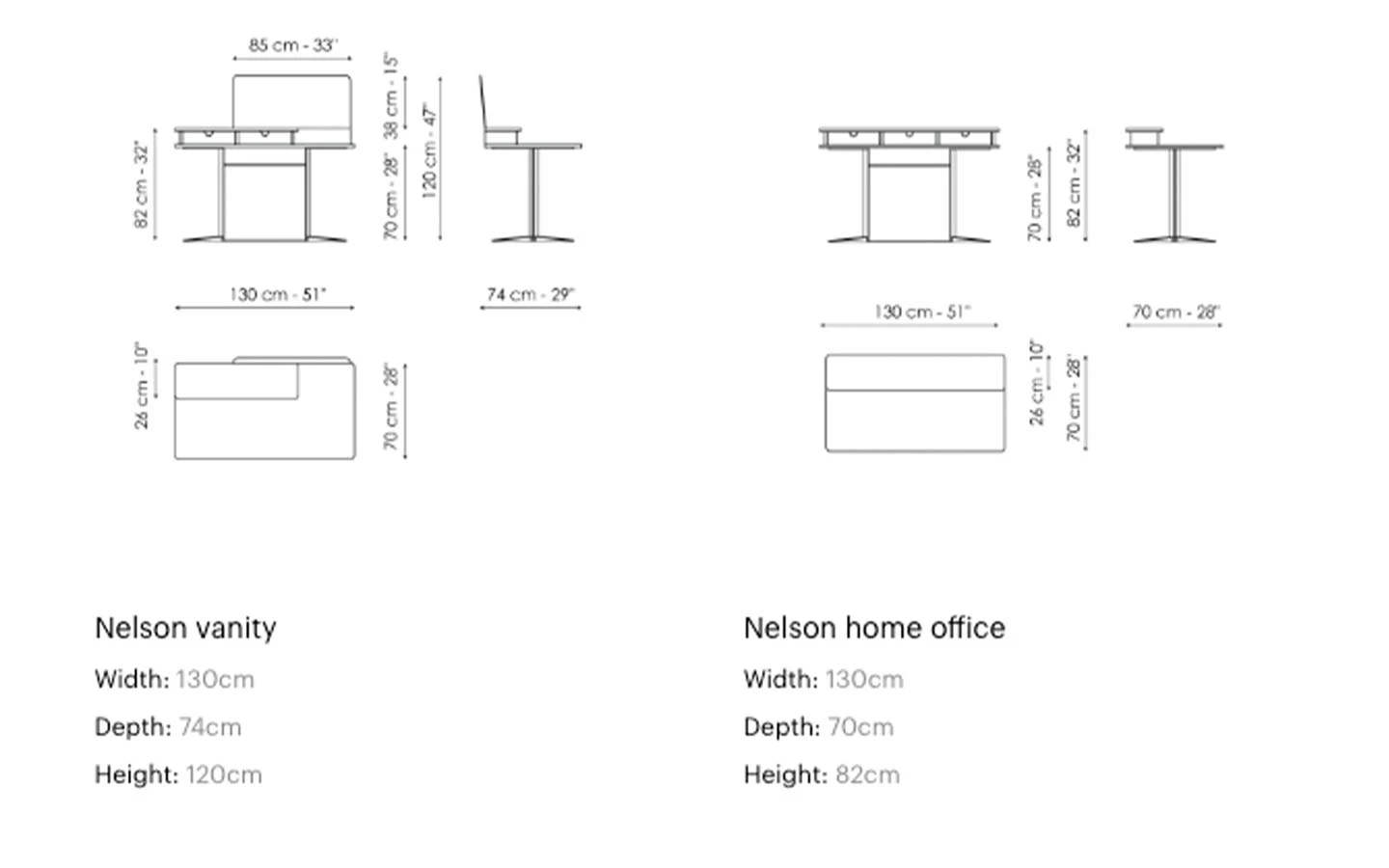 NELSON HOME OFFICE е италианско бюро от колекцията на италианския производител Bonaldo. Основата на бюрото е изработена от метал – финиш бронз. Плотът е от естествен фурнир – орех Canaletto. Три чекмеджета в лакирано дърво – финиш бронз. Цената на бюрото се формира на база на избора на вид плот и финиш на основата.