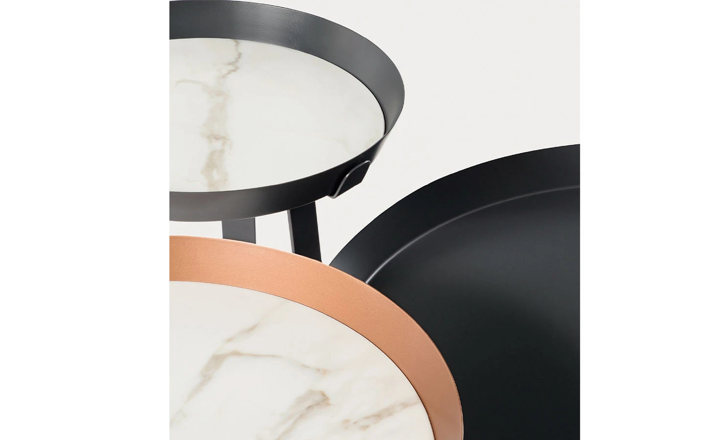 Геометричният, тънък и заоблен дизайн на структурата прави масичките FRINFRI, FRINFRI WOOD леки, а играта на равновесие поддържа практична подвижна табла – елемент, който може да бъде допълнително украсен с изискан керамичен плот.
