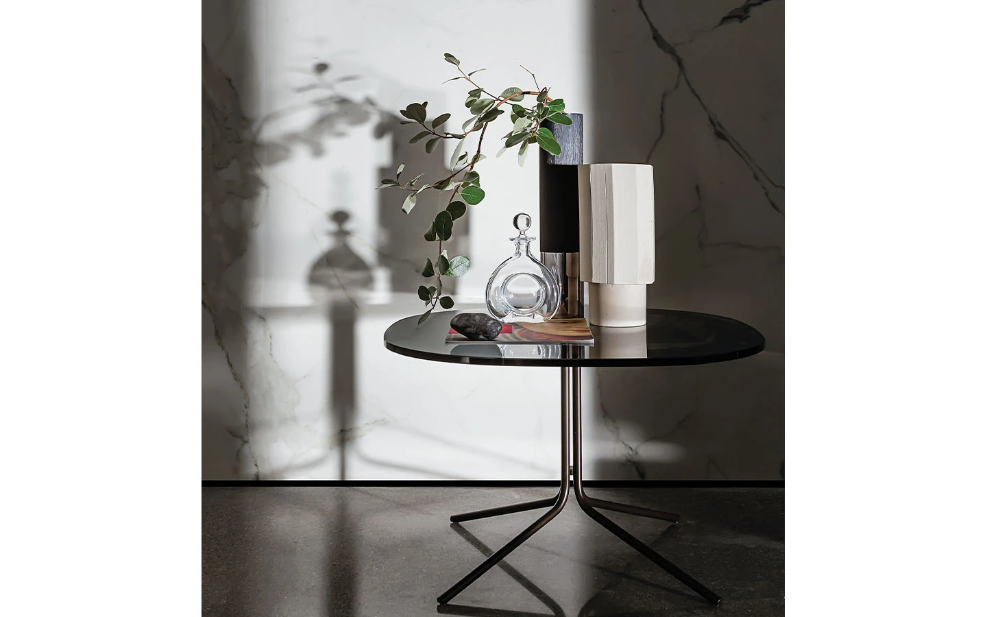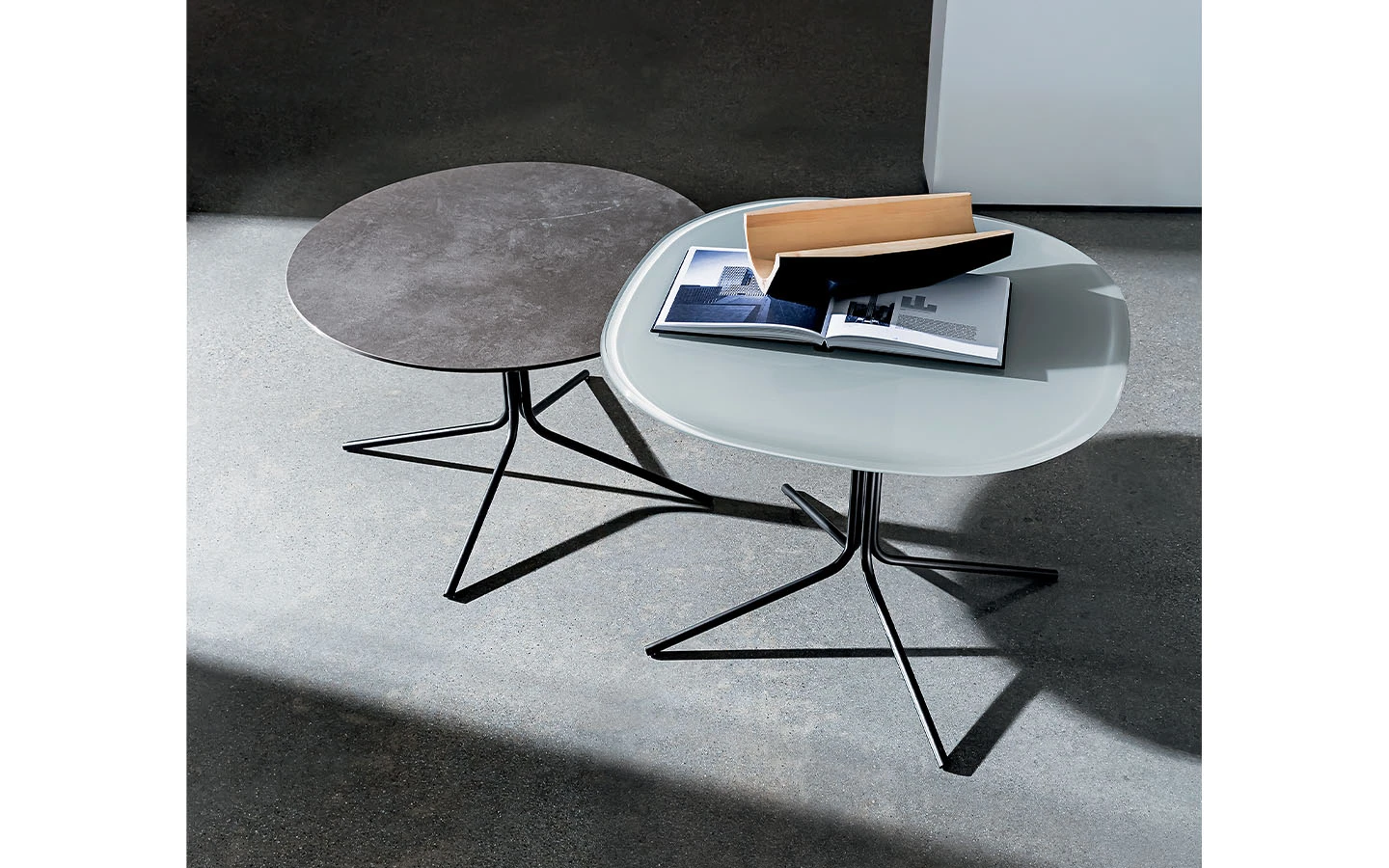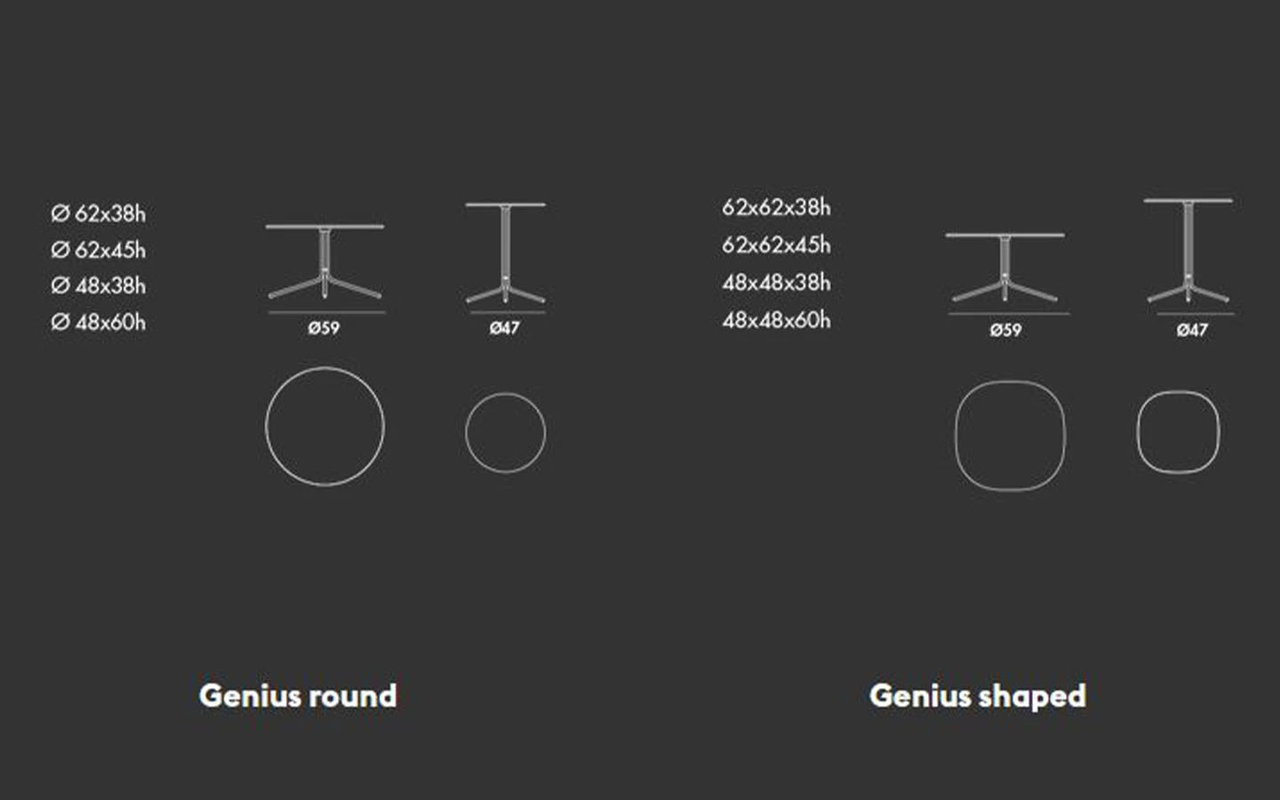 GENIUS е оригинална и универсална колекция маси за кафе, налична в различни форми, размери, материали за плота и в различни покрития за металната основа. Идеална е като масичка за лампа/кафе и перфектно се съчетава с всякакъв вид мебели, благодарение на своята универсалност.