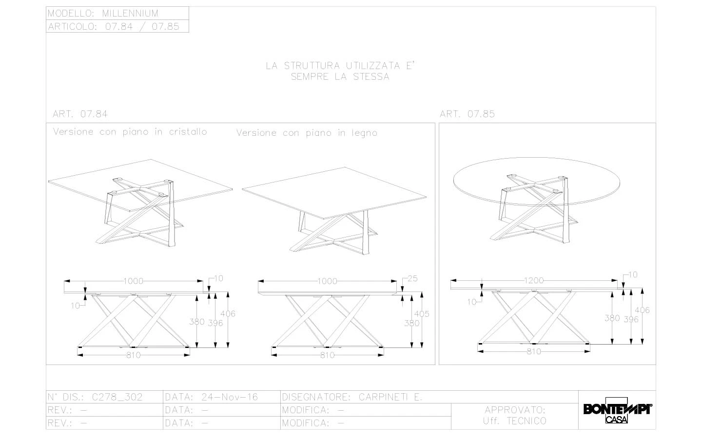 MILLENNIUM е италианска ниска маса от колекцията на италианския производител Bontempi Casa. Плотът на масата може да бъде изработен от фурнировано дърво, прозрачно стъкло, прозрачно опушено стъкло, матово стъкло с покритие против надраскване или керамика – материал и финиш по избор. Основата е изработена от метал – финиш по избор на клиента. Цената на масата се формира на база избора на размер, материал и финиш на плота и финиш на основата.
