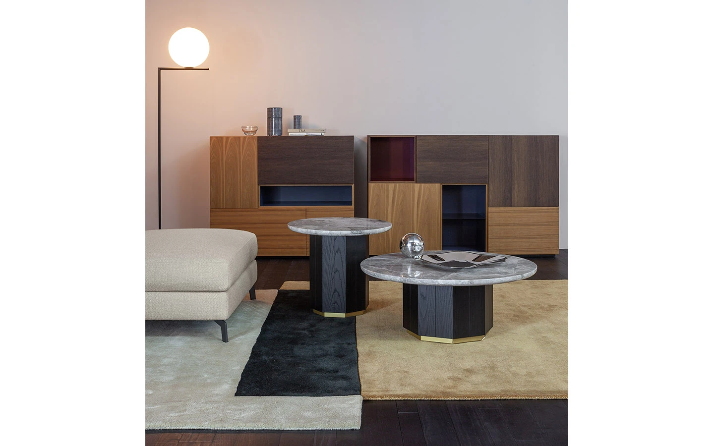 MOON е италианска ниска маса от колекцията на италианския производител Flexteam. Основата е изработена от масивно дърво ясен във финиш Абанос. Плотът е изработен от мрамор във финиш Emperador Grey или Pietra Grey. Цената на масата се формира на база на избора на размер.