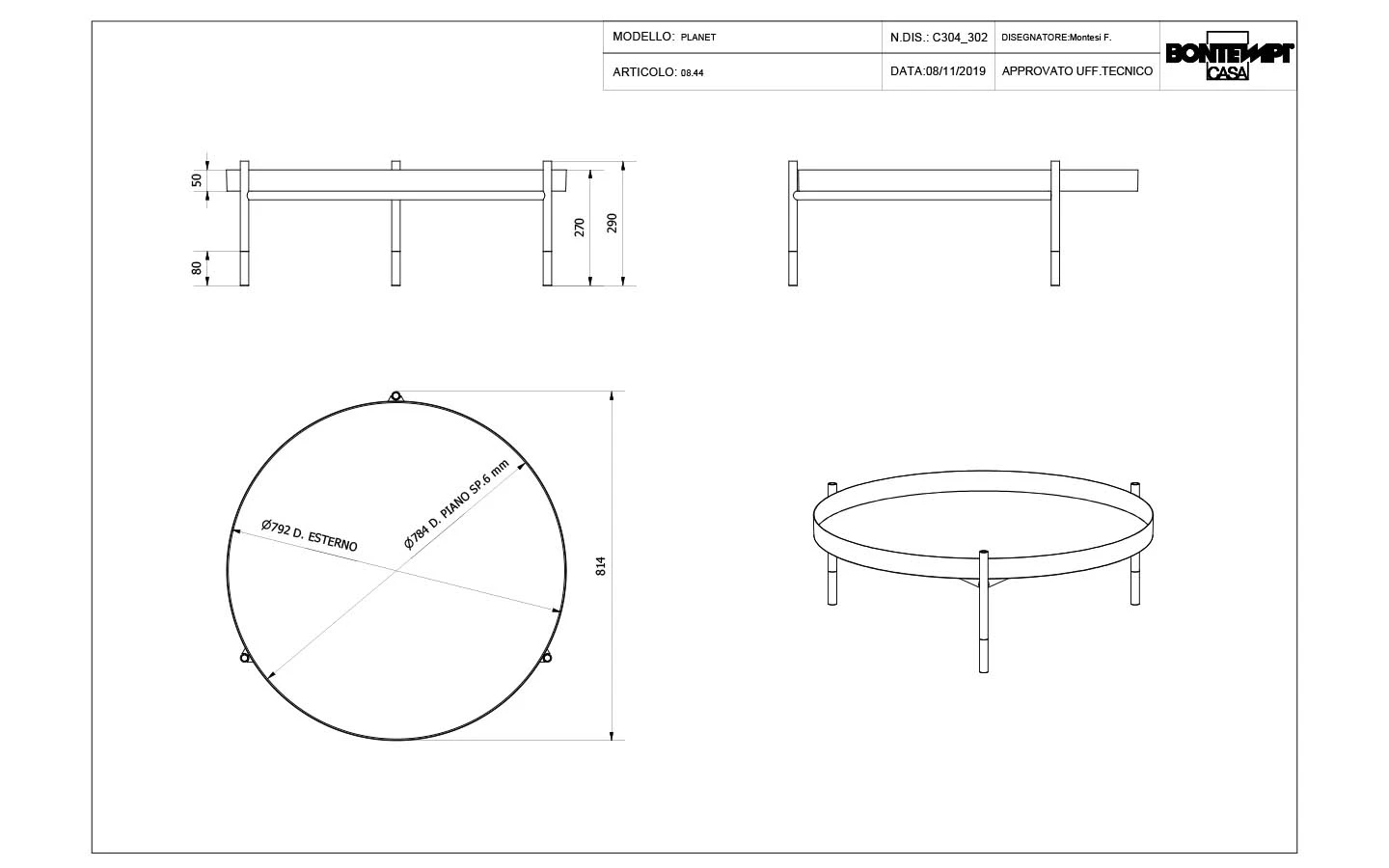 PLANET е италианска ниска маса от колекцията на италианския производител Bontempi Casa. Плотът на масата може да бъде изработен от лъскаво стъкло, матово стъкло с покритие против надраскване или керамика – материал и финиш по избор. Основата е изработена от метал – финиш по избор на клиента. Цената на масата се формира на база избора на размер, материал и финиш на плота и финиш на основата.