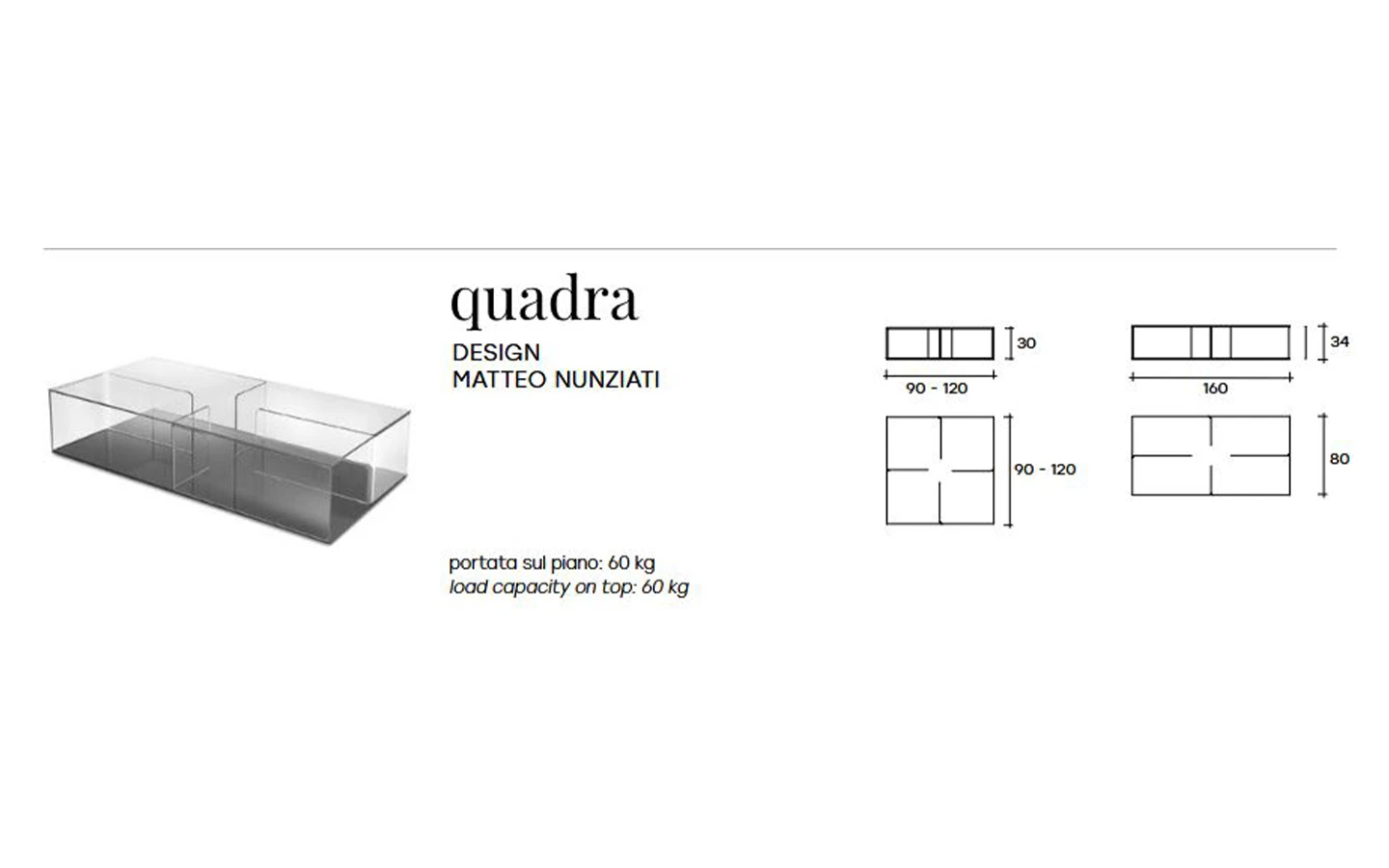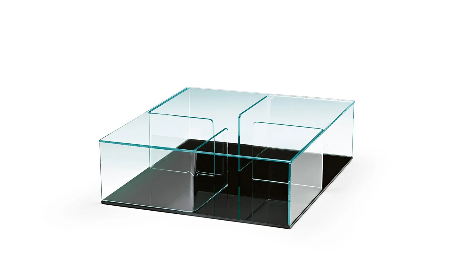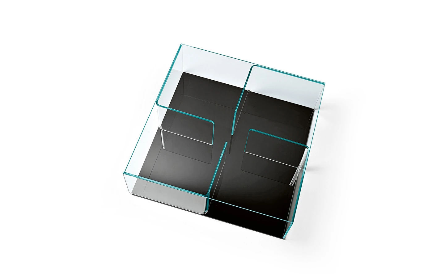 Ниската маса QUADRA от FIAM Italia, проектирана от Matteo Nunziati, е функционална маса за съхранение, съставена от четири извити стъклени елемента, монтирани между две стъкла. Дизайнът създава игра на плътни и празни пространства, като светлината се отразява върху плоските и извити стъклени повърхности, създавайки уникални визуални ефекти. Този минималистичен дизайн прави масата QUADRA универсална за различни интериорни стилове, като съчетава функционалност и естетическа елегантност.