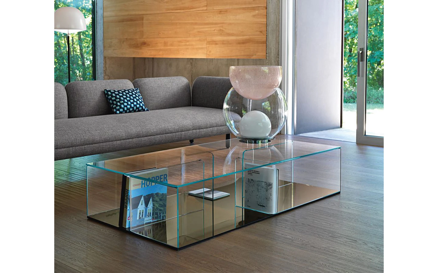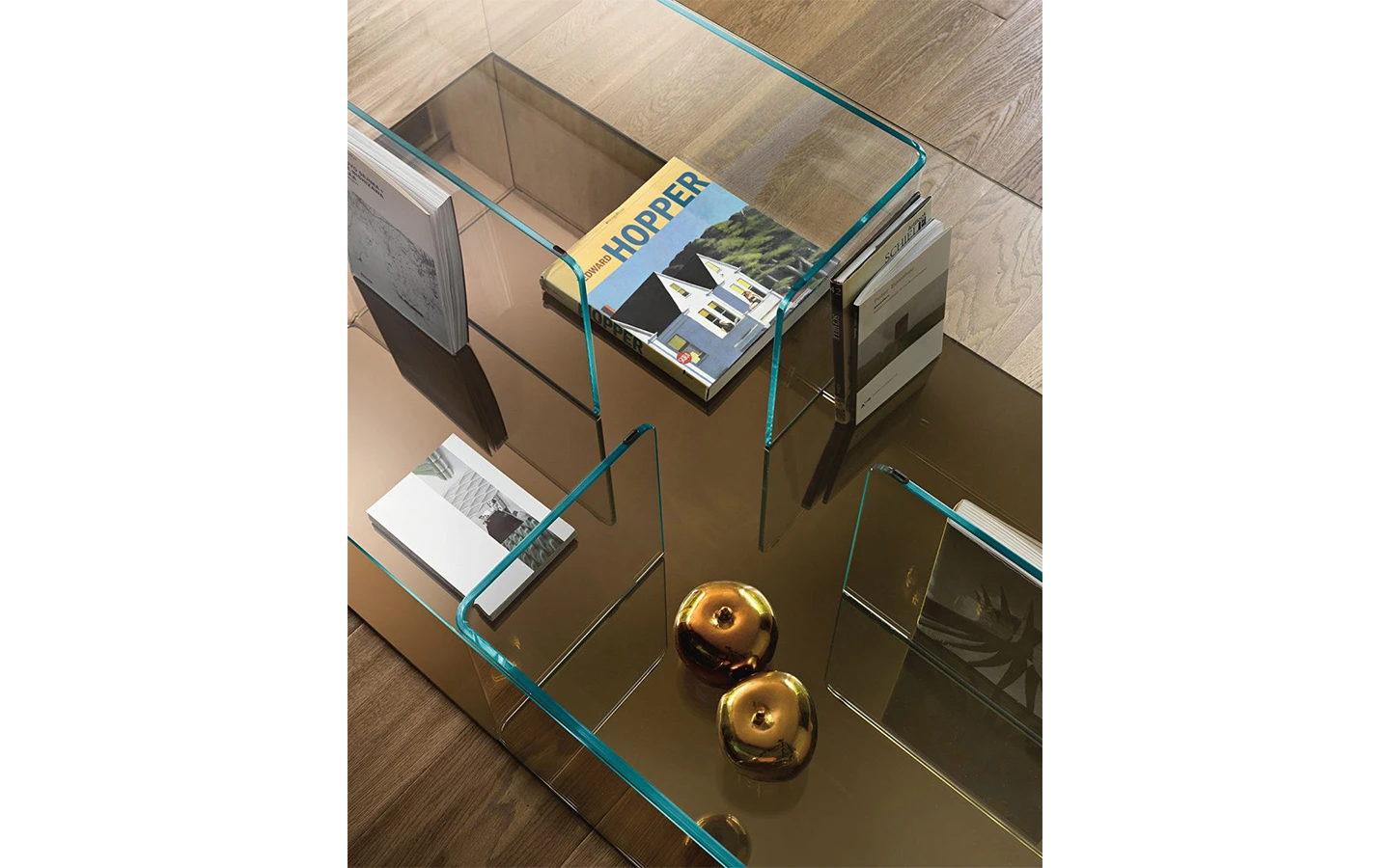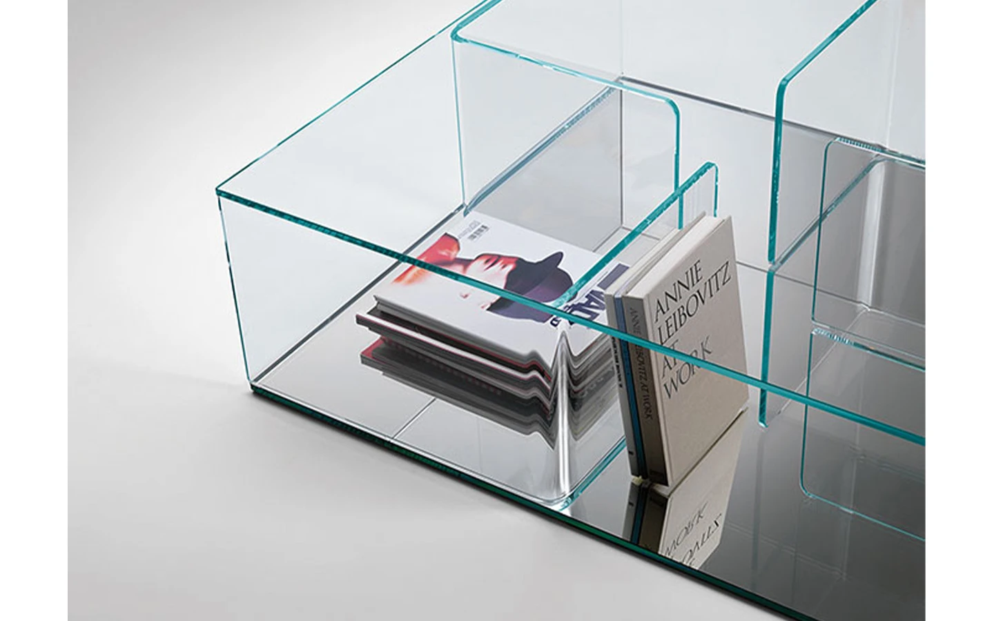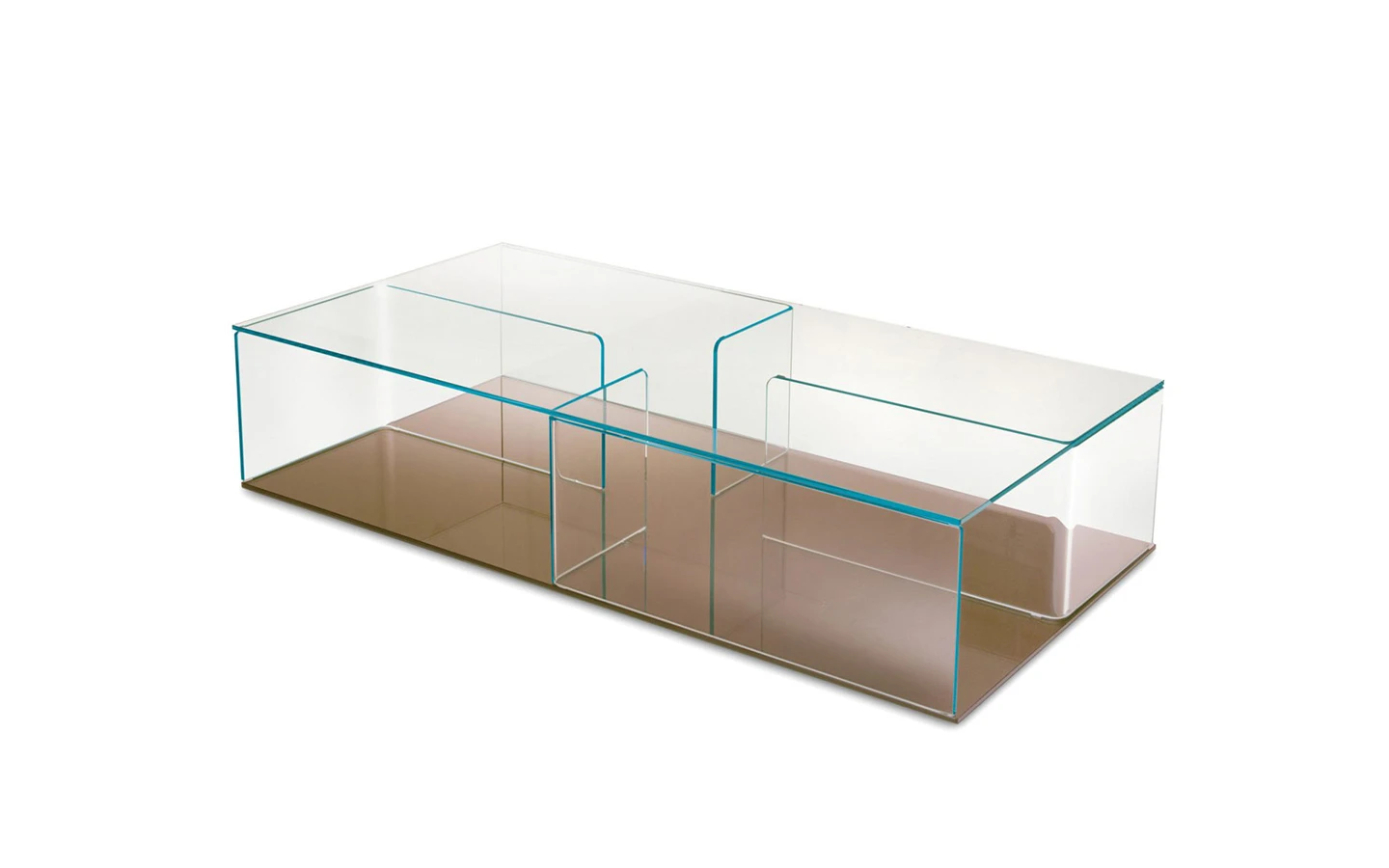 Ниската маса QUADRA от FIAM Italia, проектирана от Matteo Nunziati, е функционална маса за съхранение, съставена от четири извити стъклени елемента, монтирани между две стъкла. Дизайнът създава игра на плътни и празни пространства, като светлината се отразява върху плоските и извити стъклени повърхности, създавайки уникални визуални ефекти. Този минималистичен дизайн прави масата QUADRA универсална за различни интериорни стилове, като съчетава функционалност и естетическа елегантност.