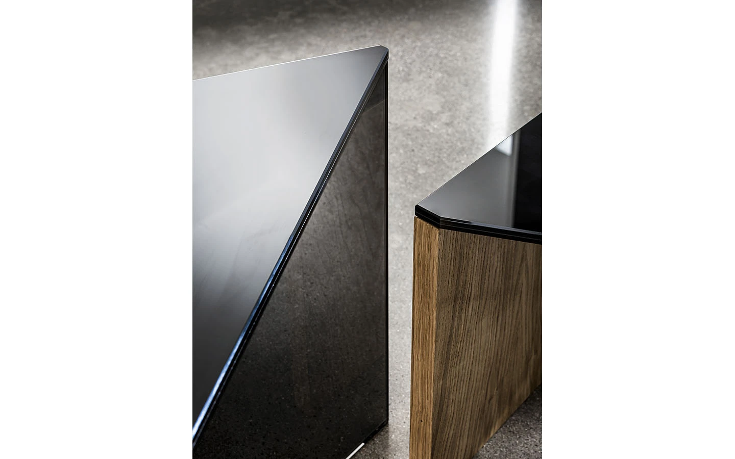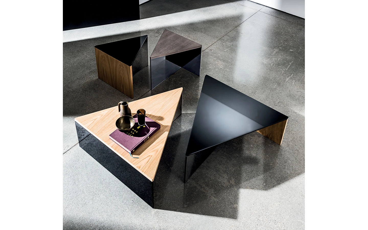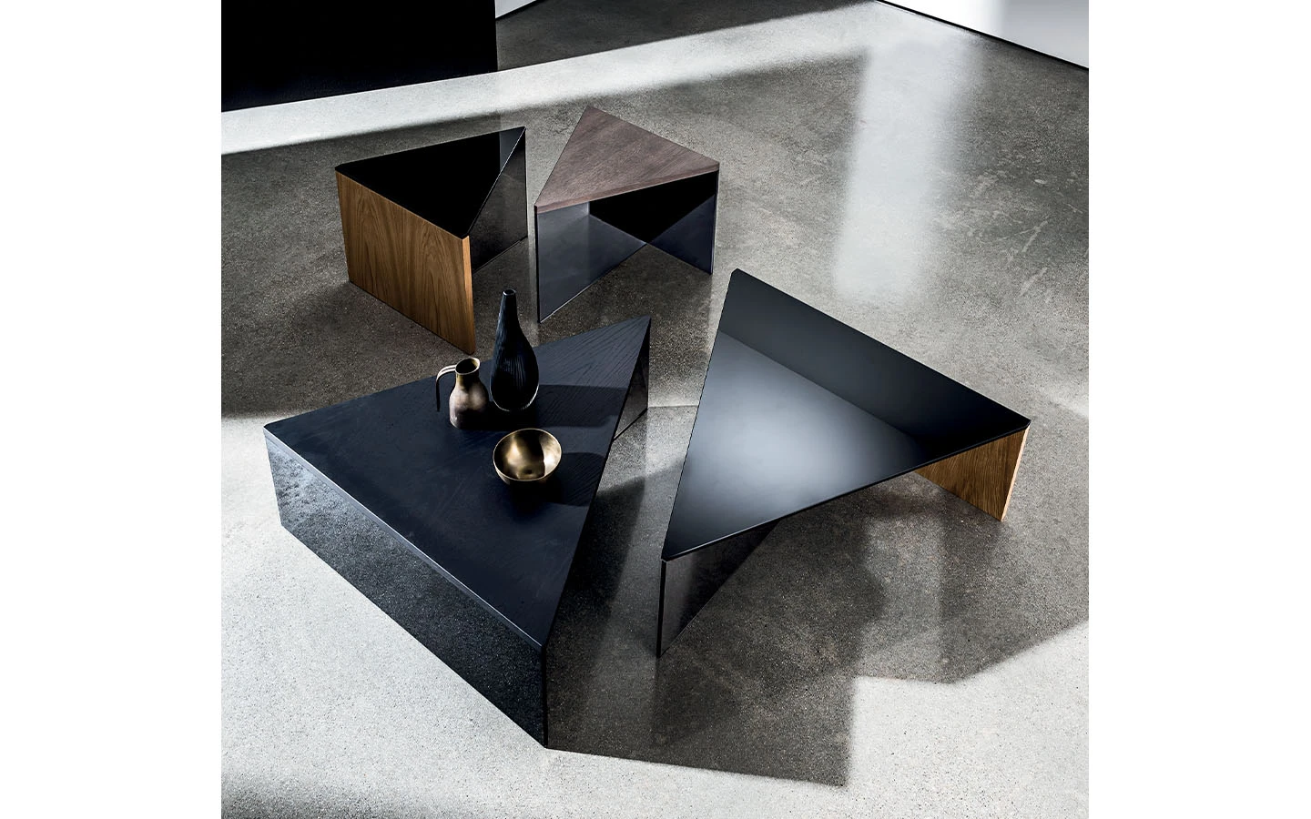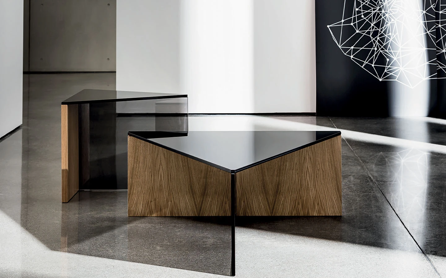 REGOLO TRIANGULAR е италианска ниска маса от колекцията на италианския производител Sovet. Плотът може да бъде изработен от черно стъкло или от дърво – финиш по избор на клиента. При варианта с плот от черно стъкло, основата се състои от елемент от опушено стъкло и дървен елемент – финиш по избор. При варианта с дървен плот, основата е съставена от елемент от опушено стъкло и елемент от черно стъкло. Цената на масата се формира на база на избора на размер.