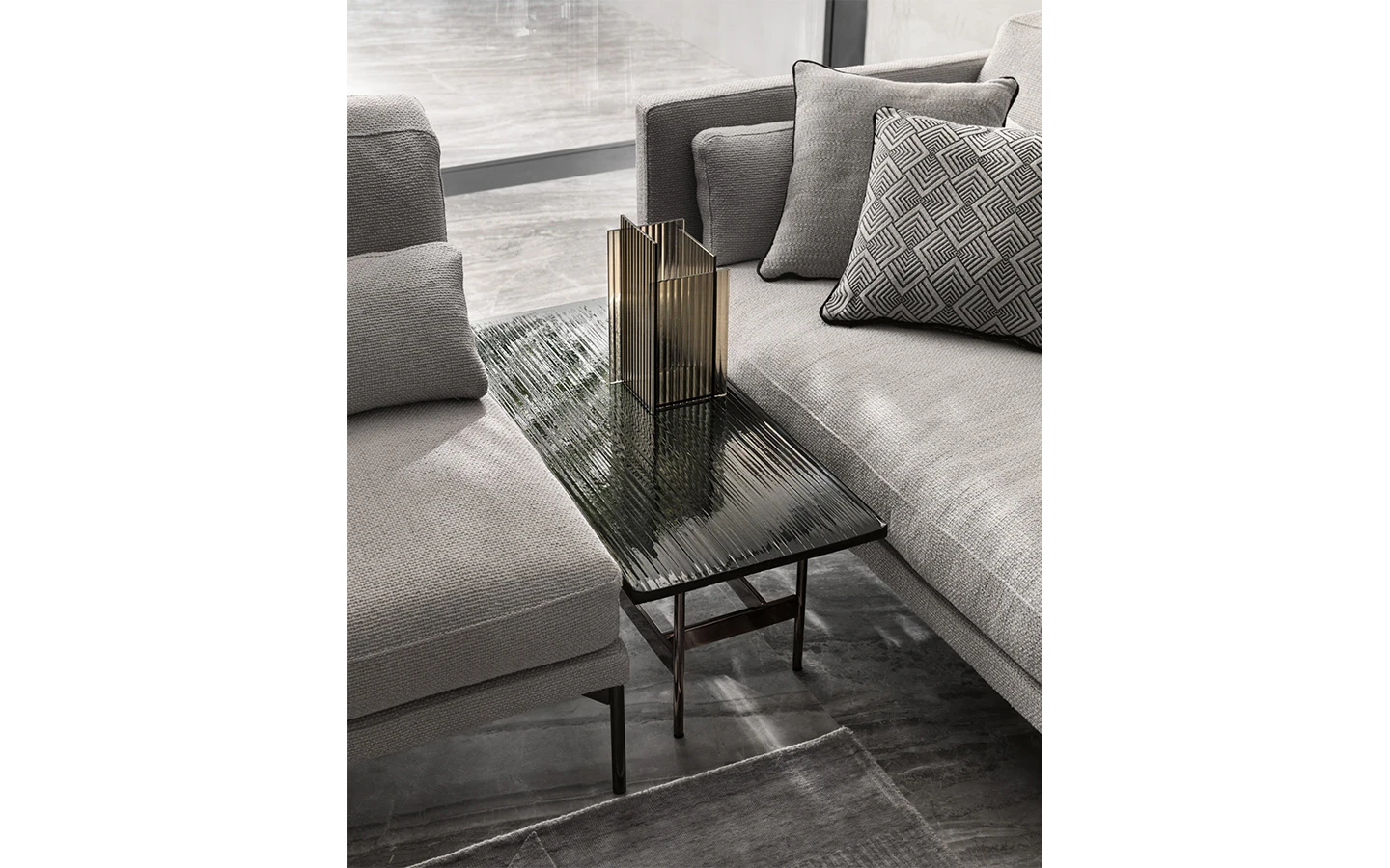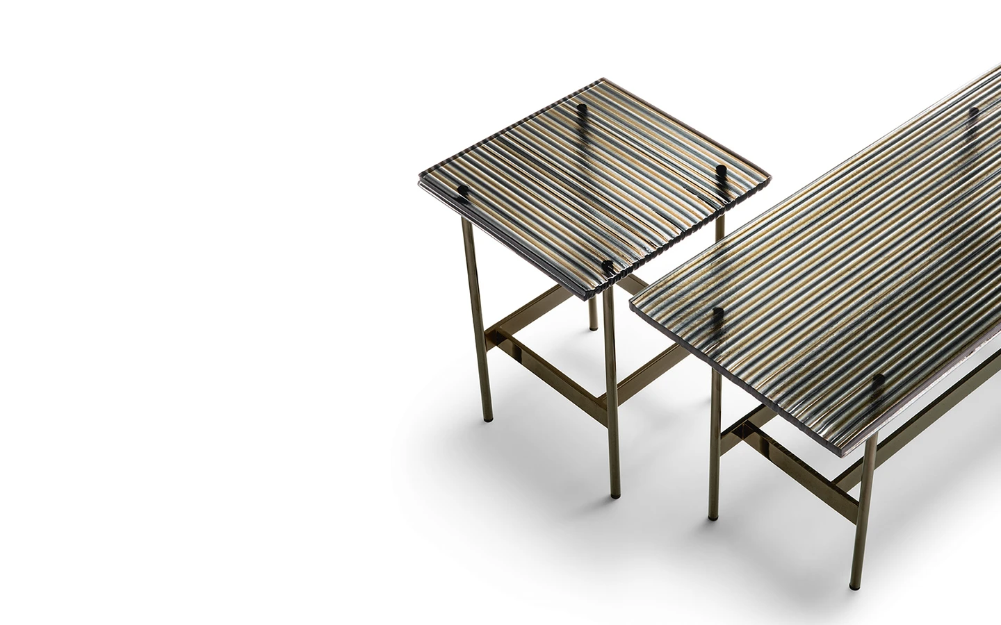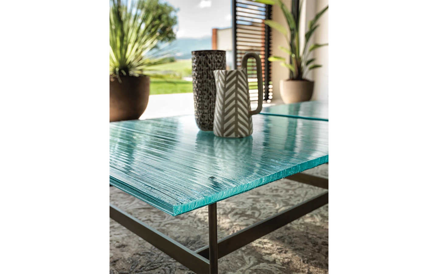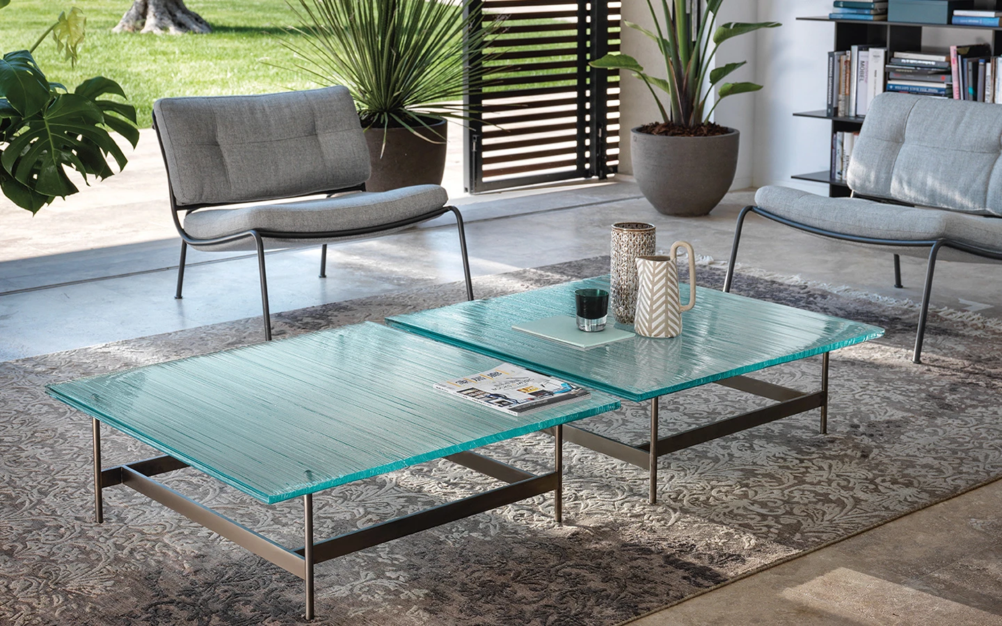Ниската маса WAVES от FIAM Italia, проектирана от Ludovica + Roberto Palomba, демонстрира иновативно стъкларско майсторство и модерен дизайн. Този дизайн предоставя уникално визуално изживяване, като изгледът на стъклените повърхности се променя в зависимост от ъгъла на наблюдение, създавайки динамичен ефект.