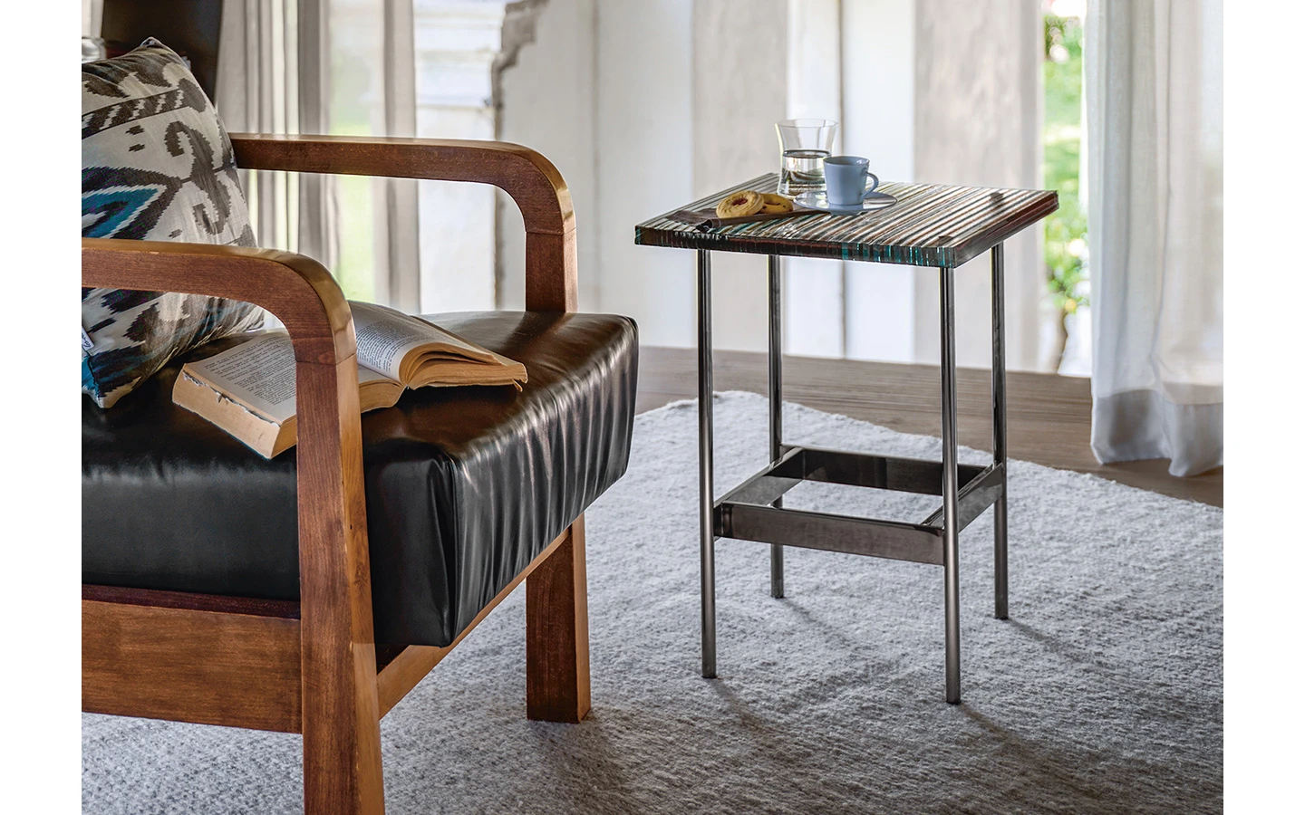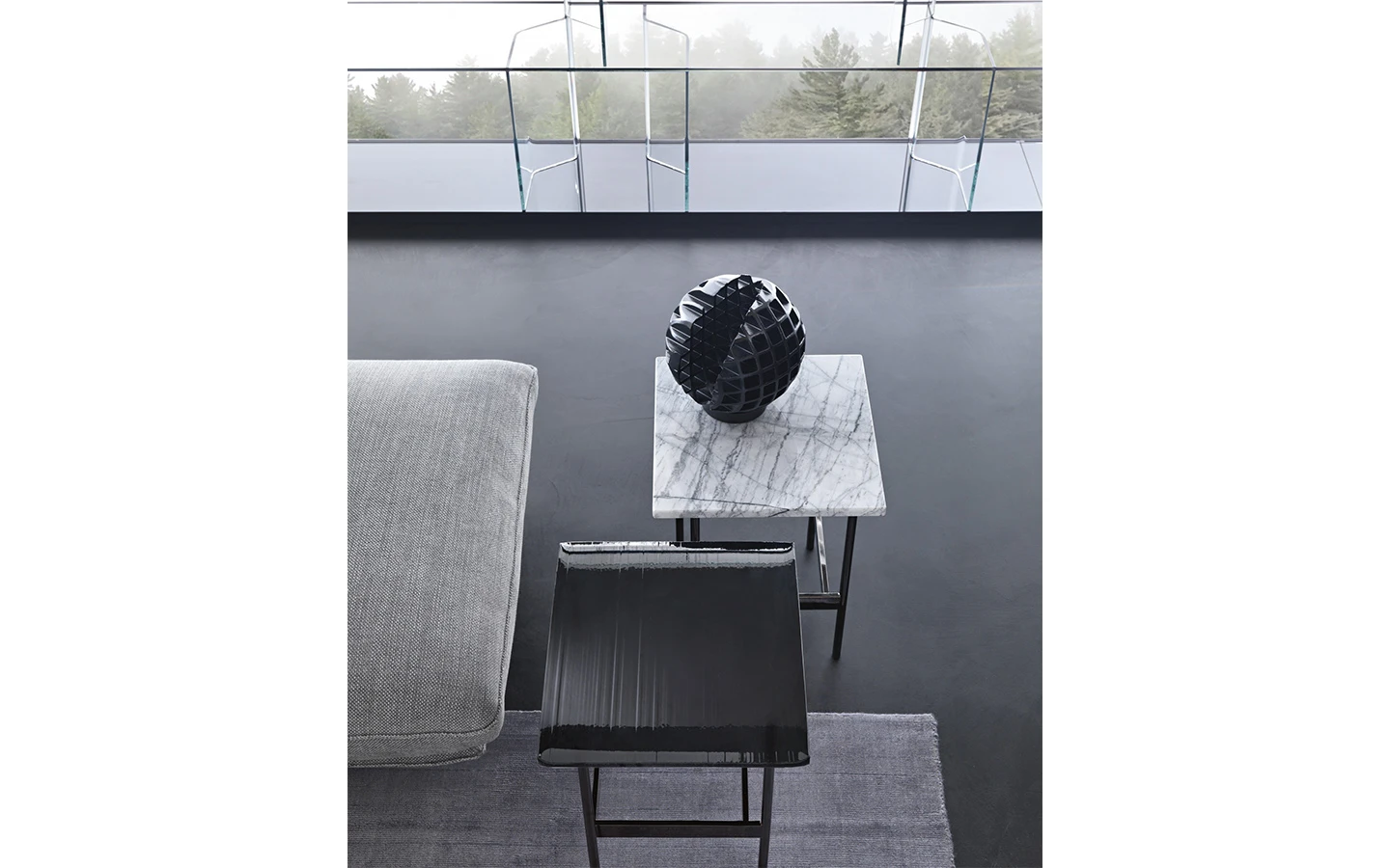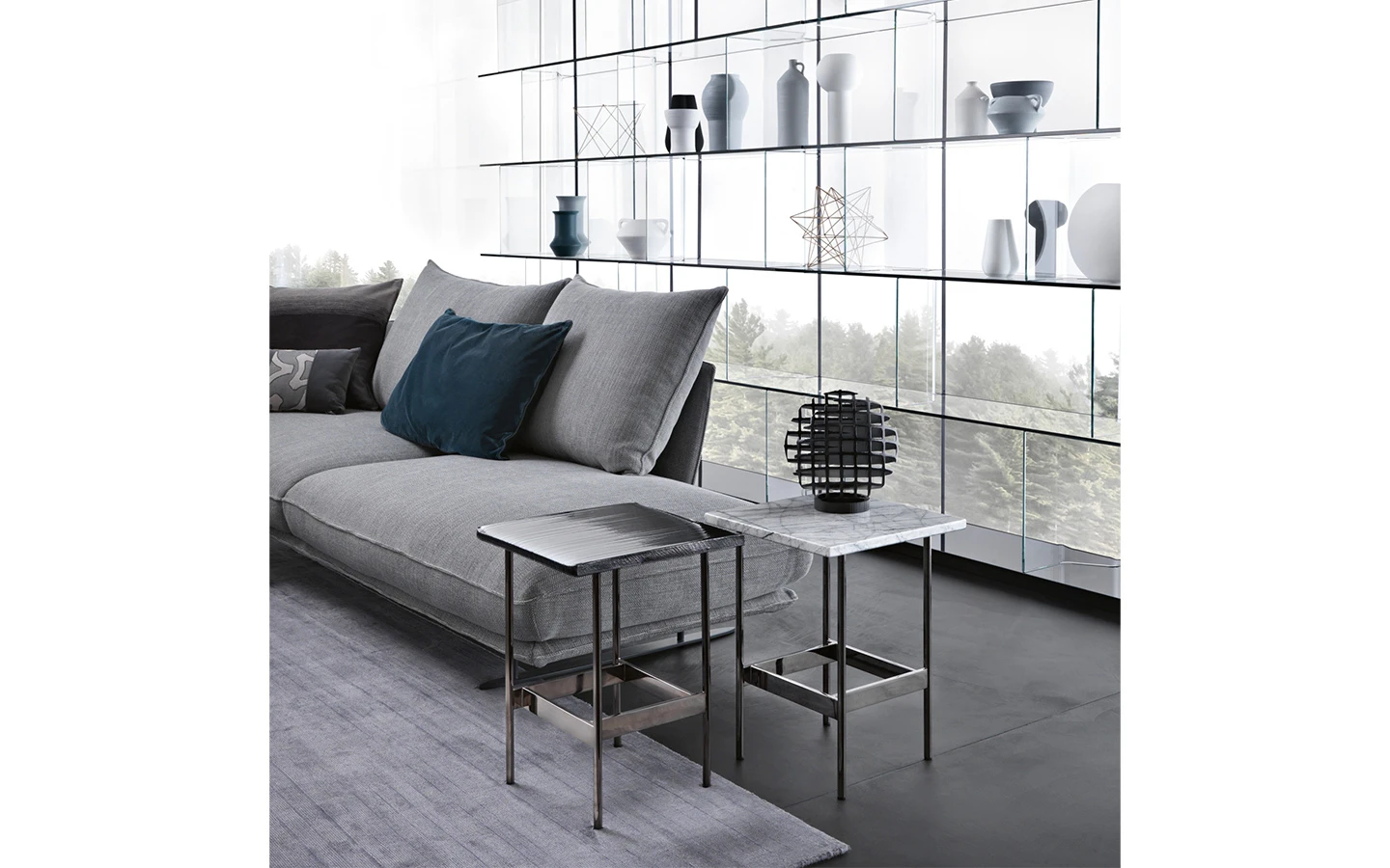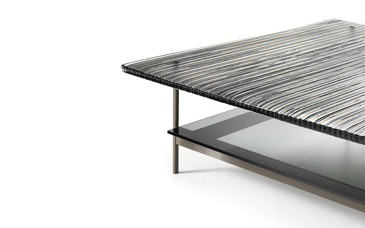 Ниската маса WAVES от FIAM Italia, проектирана от Ludovica + Roberto Palomba, демонстрира иновативно стъкларско майсторство и модерен дизайн. Този дизайн предоставя уникално визуално изживяване, като изгледът на стъклените повърхности се променя в зависимост от ъгъла на наблюдение, създавайки динамичен ефект.