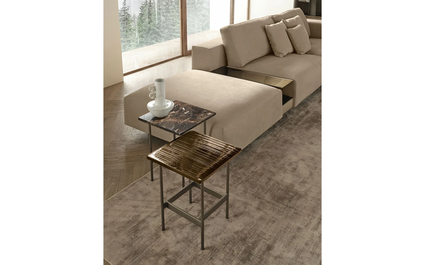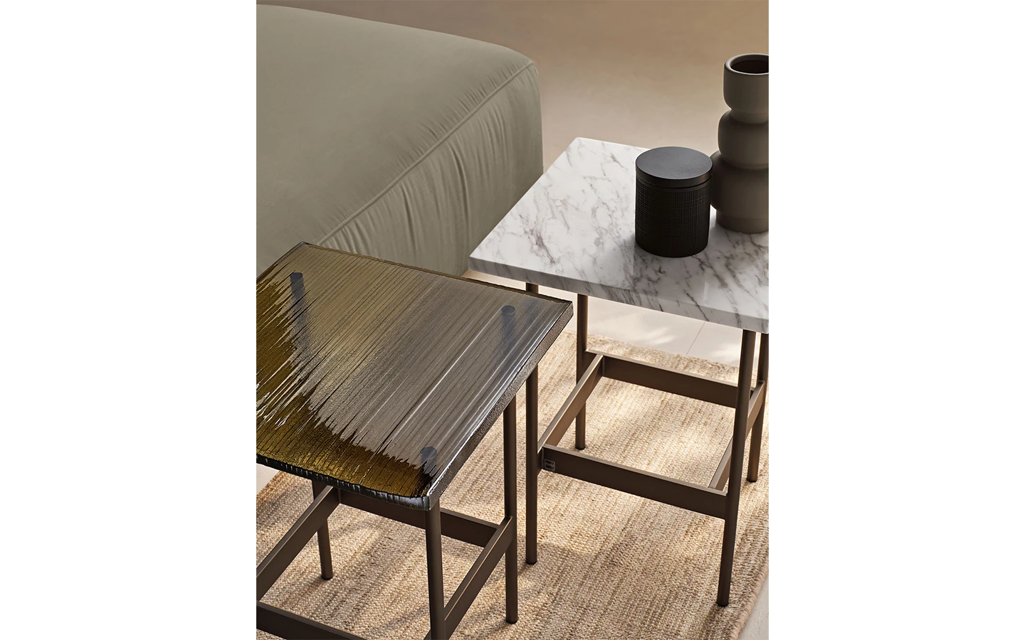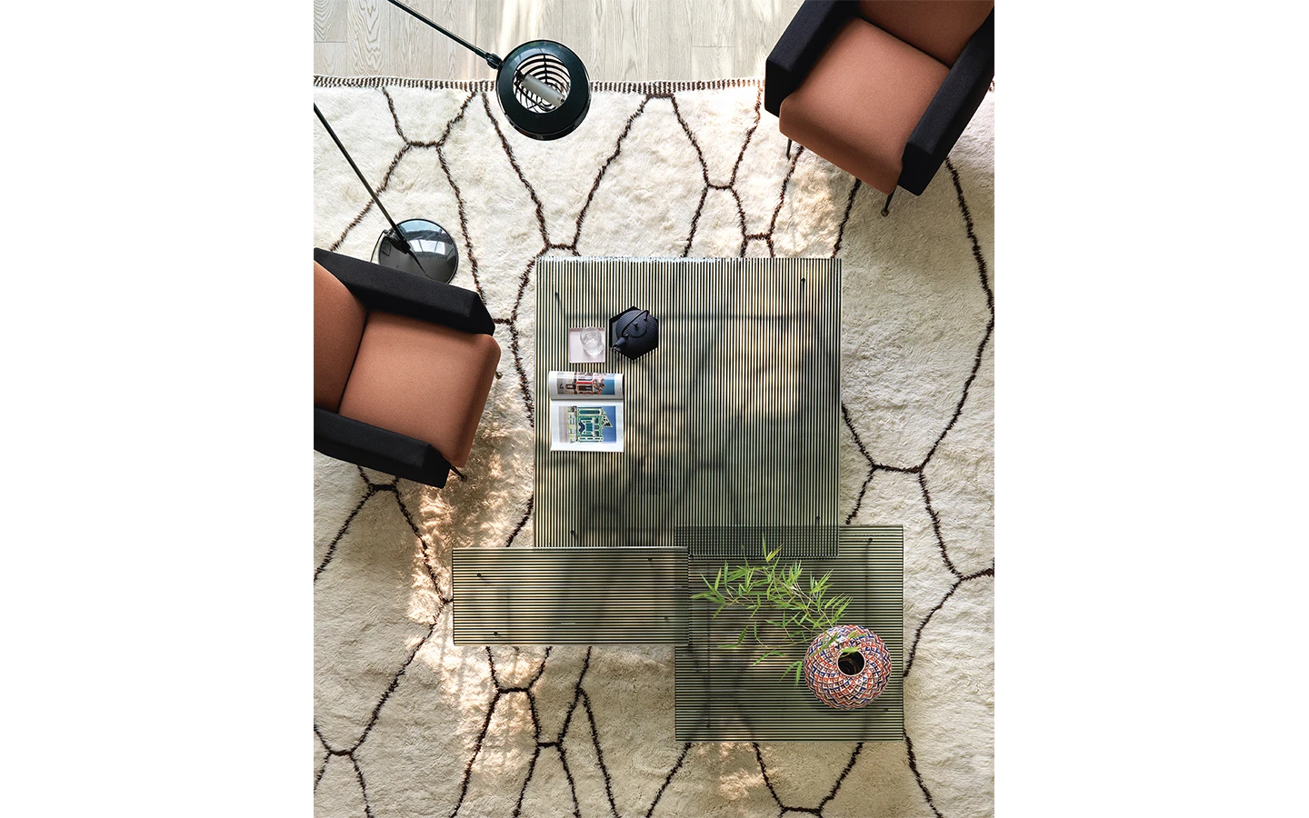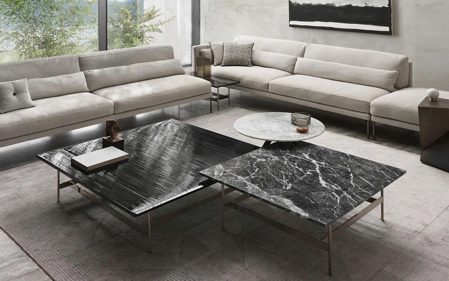 Ниската маса WAVES от FIAM Italia, проектирана от Ludovica + Roberto Palomba, демонстрира иновативно стъкларско майсторство и модерен дизайн. Този дизайн предоставя уникално визуално изживяване, като изгледът на стъклените повърхности се променя в зависимост от ъгъла на наблюдение, създавайки динамичен ефект.