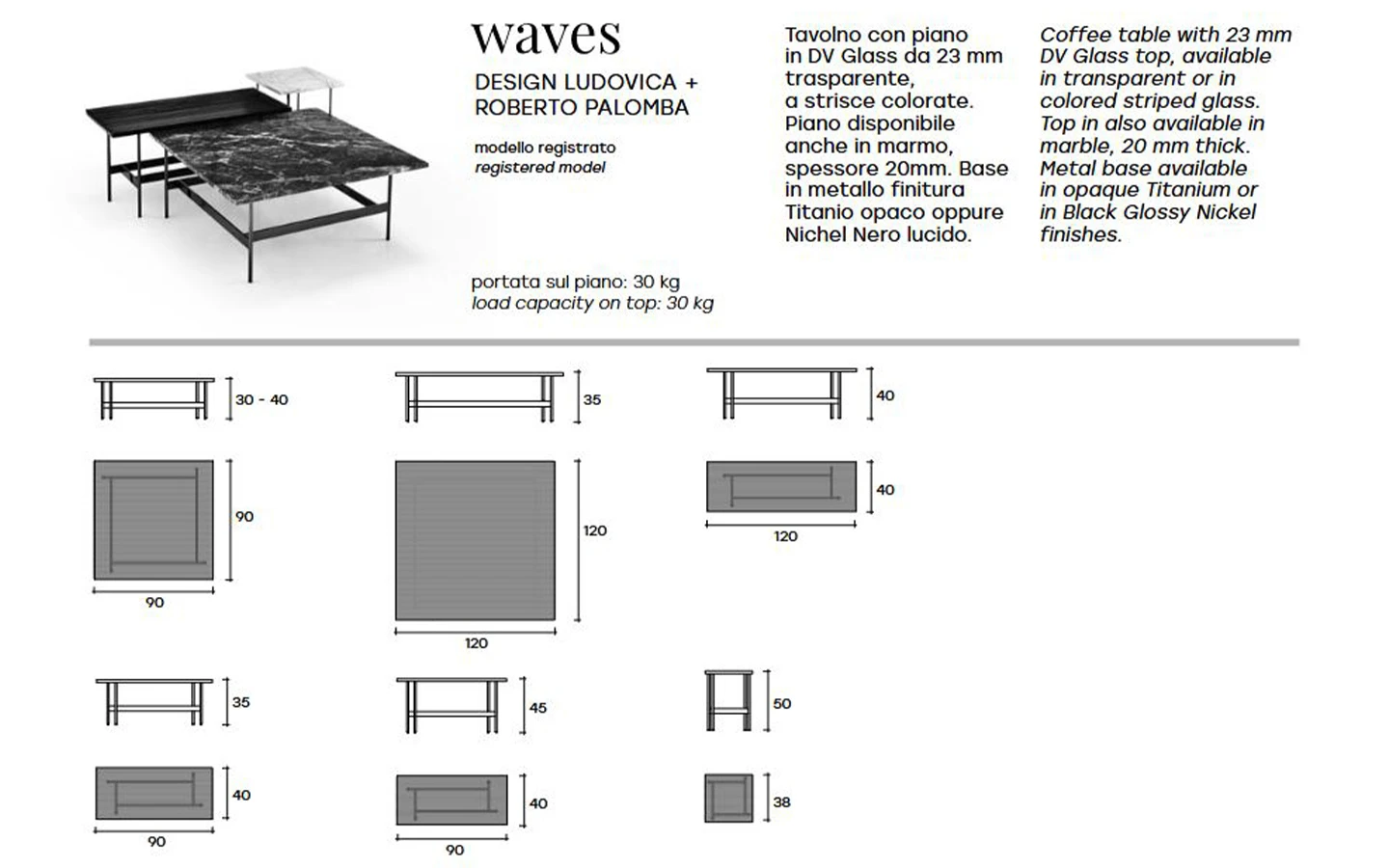 WAVES е италианска ниска маса от колекцията на италианския производител FIAM Italia. Плотът на масата е изработен от DV стъкло – прозрачно, опушено, бронзово или многоцветно, или от мрамор – финиш по избор. Основата е изработена от метал финиш Opaque Titanium или Black Glossy Nickel. Цената на масата се формира на база избора на размер и материал и финиш на плота.