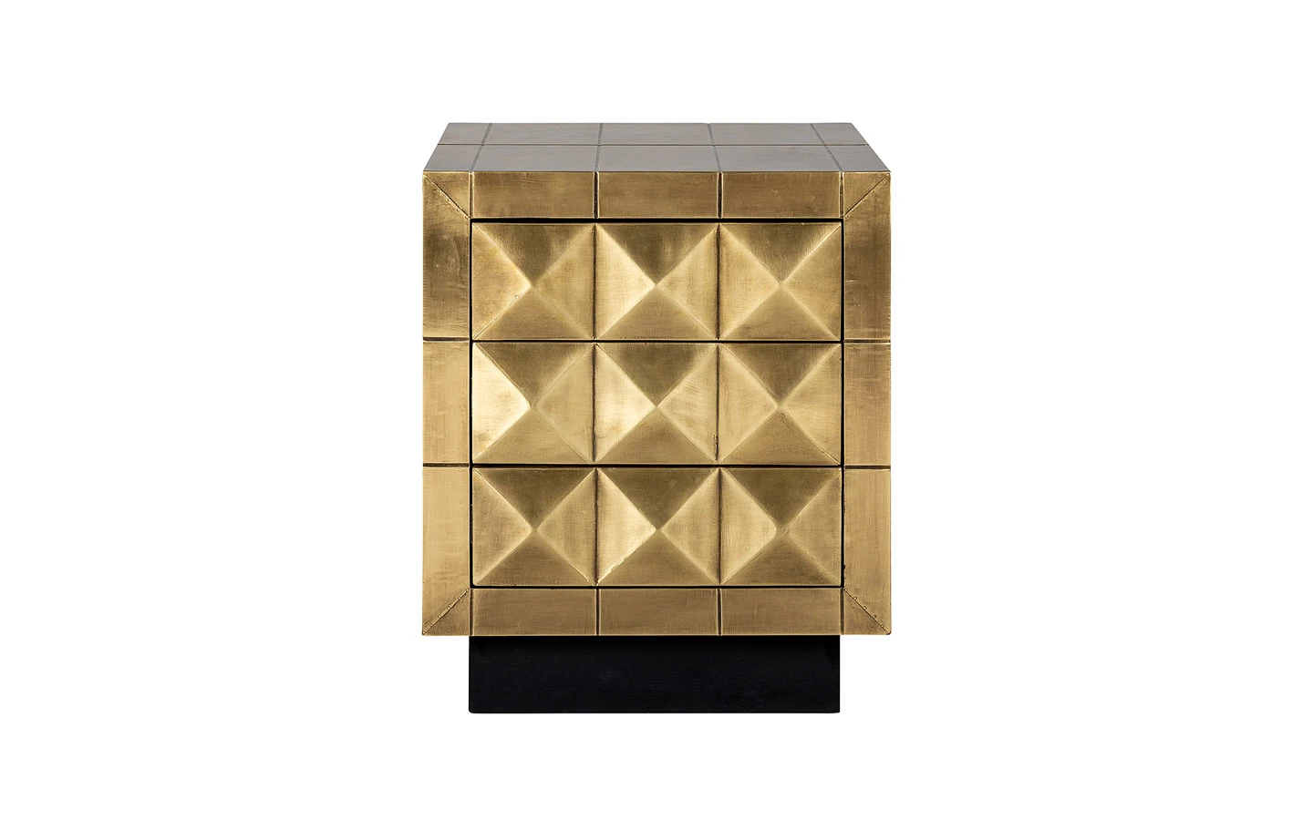 Нощното шкафче COLLADA 3 DRAWERS от Richmond Interiors е изключително елегантен и стилен елемент, който съчетава функционалност с изискан дизайн. Със своята златиста четкана повърхност и впечатляващ пирамидален мотив, това шкафче привлича вниманието и добавя нотка на лукс към всяко пространство. Изработено от висококачествени материали като месинг и MDF, COLLADA гарантира дълготрайност и стабилност. Трите плавно плъзгащи се чекмеджета осигуряват достатъчно място за съхранение на лични вещи, документи или аксесоари, като същевременно поддържат изчистен и подреден вид на помещението. С компактните си размери нощното шкафче е подходящо както за спални, така и за дневни или коридори. COLLADA 3 DRAWERS е перфектният избор за тези, които търсят съчетание от модерна естетика и практичност, добавяйки изтънчен акцент към интериора си.