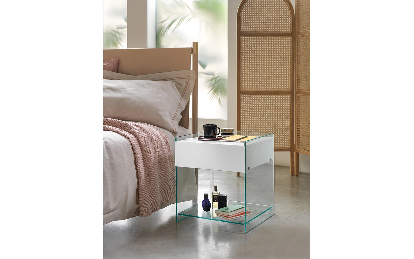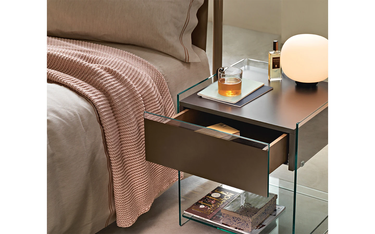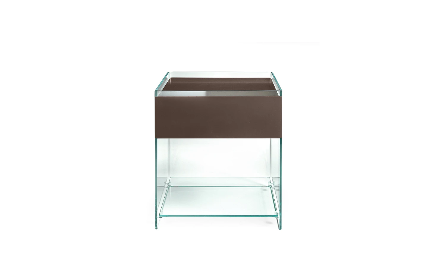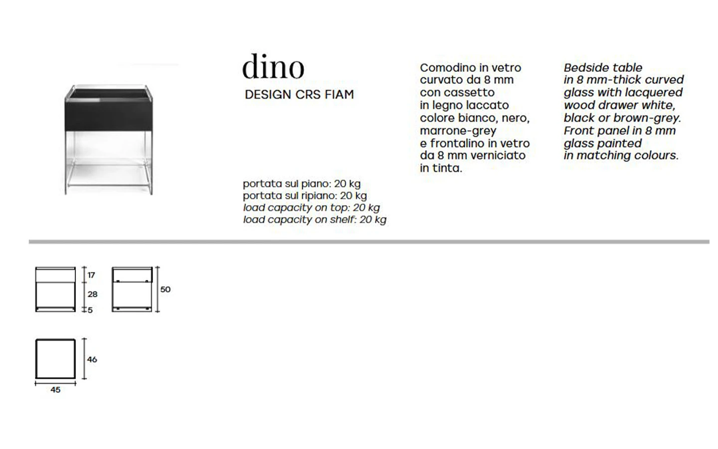 DINO е нощно шкафче от италианския производител FIAM Italia. Нощното шкафче е изработено от извито стъкло. Чекмеджето е изработено от дърво – финиш по избор. Фронталният панел е изработен от стъкло в съответстващ цвят. Опционално към шкафчето може да се добави рафт, изработен от стъкло с дебелина 8 мм.