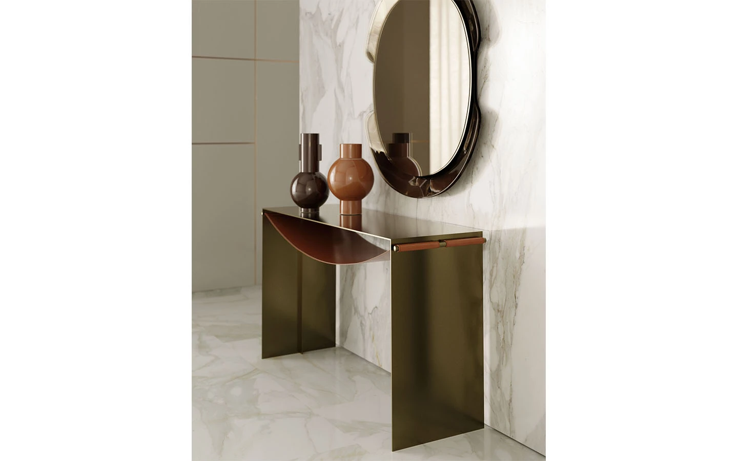 Огледалото PEAK от Bontempi Casa, проектирано от Luca Roccadadria, е елегантно стенно огледало с характерна неправилна кръгла форма. Огледалото разполага с извита и текстурирана рамка, която частично обгръща огледалната повърхност, създавайки дълбочина и визуален акцент. Уникалният дизайн на PEAK, съчетан с висококачествените покрития, го прави универсално допълнение към различни интериорни стилове, където то служи както като функционален елемент, така и като декоративно арт произведение.