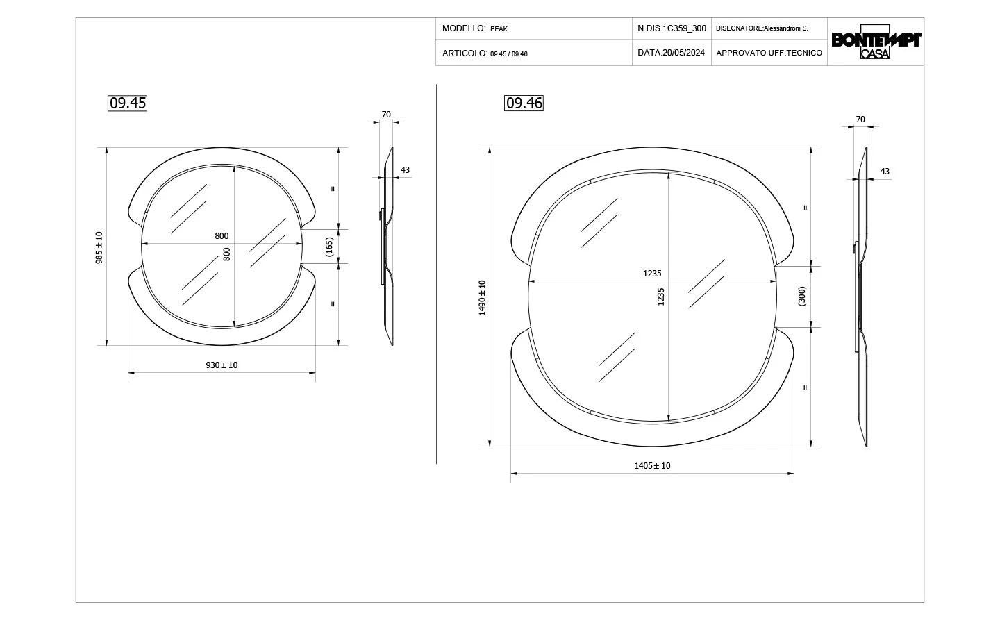 PEAK е италианско огледало от колекцията на италианския производител Bontempi. Огледалото се предлага във финиши – бронзово огледалo или опушено огледалo. Цената се определя спрямо избора на размер.
