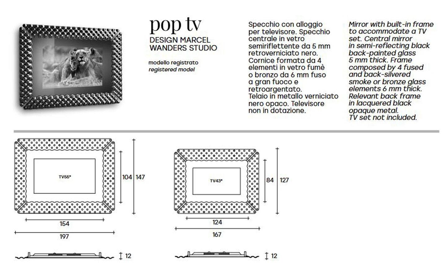 POP TV е италианско огледало/рамка за телевизор от колекцията на италианския производител FIAM Italia. Централната част на огледалото е изработено от полу-рефлекторно стъкло. Рамката е изработена от четити стъклени елемента в опушен или бронзов финиш. Цената се определя спрямо избора на размер.
