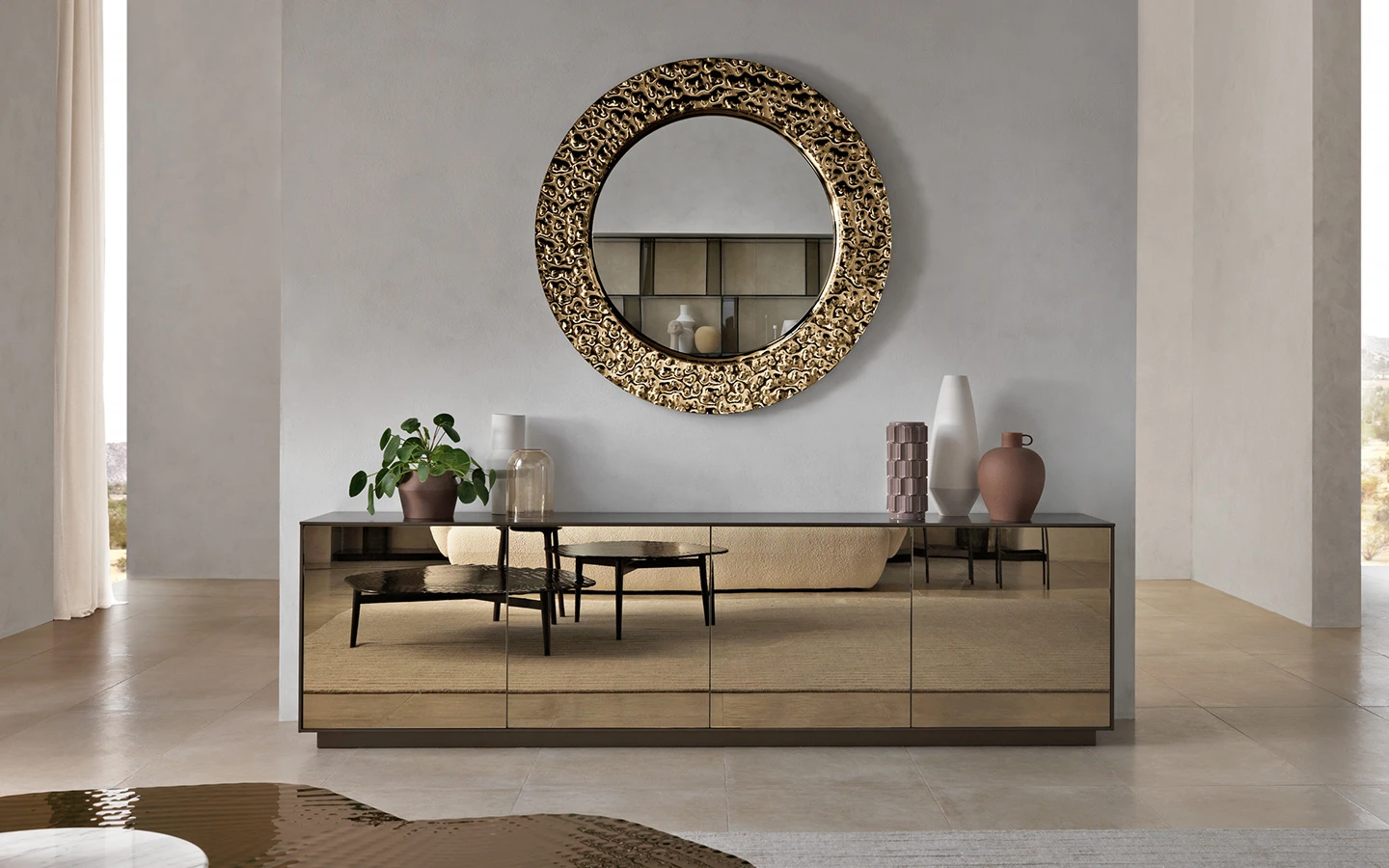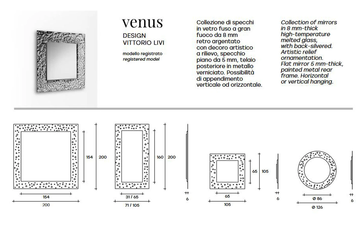 Огледалото VENUS, проектирано от Vittorio Livi за FIAM Italia, е изискано огледало за стена, което демонстрира изключително майсторство в обработката на стъкло. VENUS е израз на ангажимента на FIAM Italia към иновациите в стъкления дизайн, превръщайки го в впечатляващ елемент за съвременния интериор.