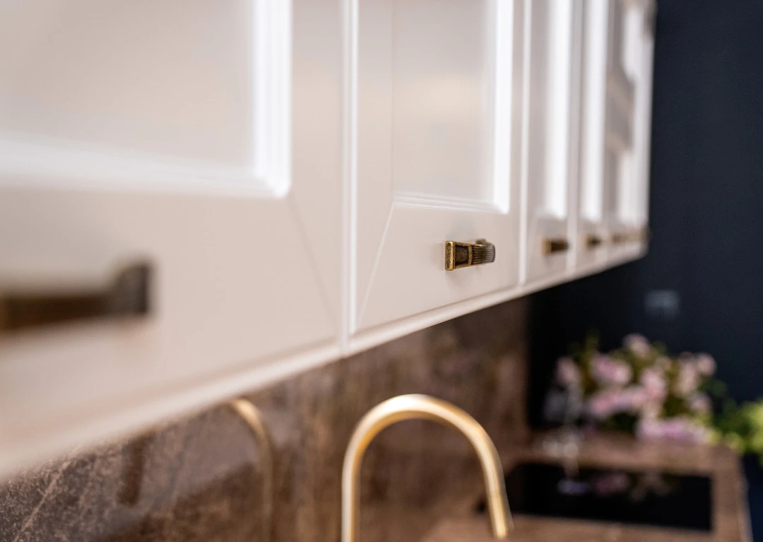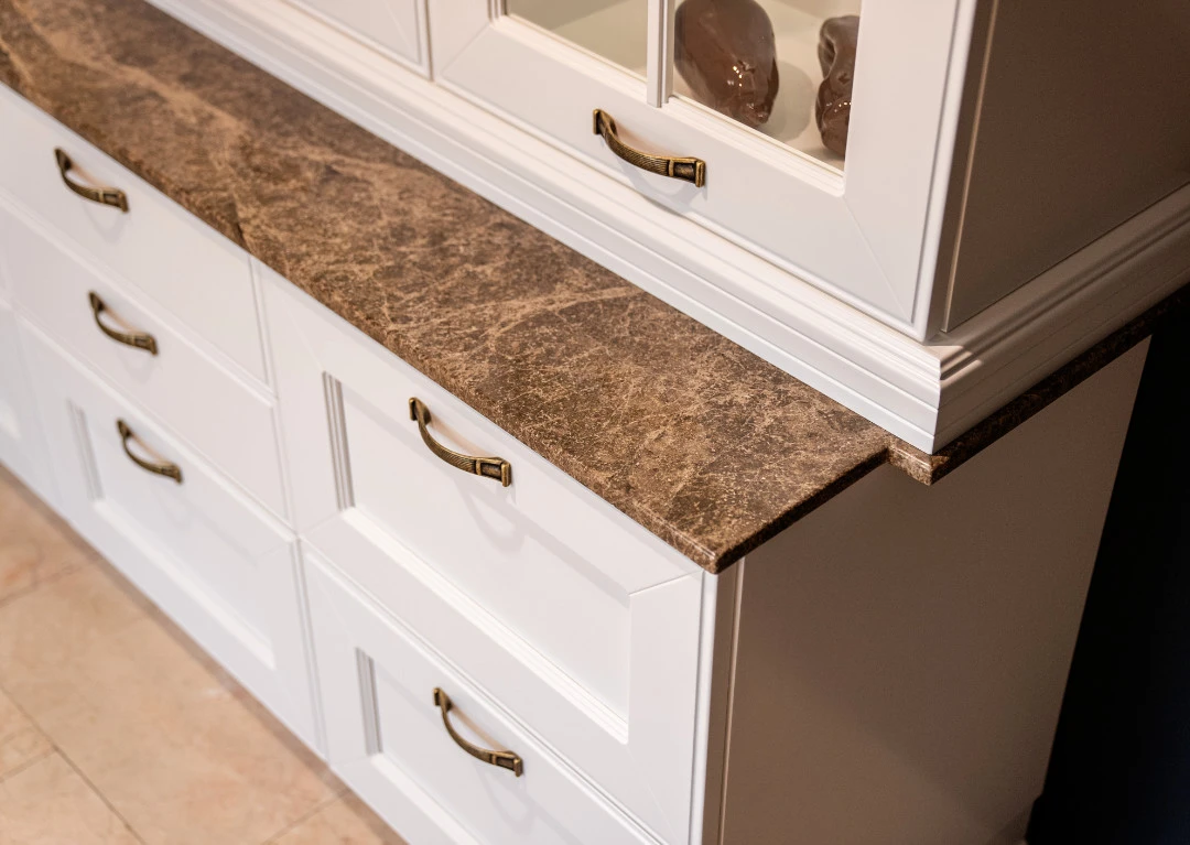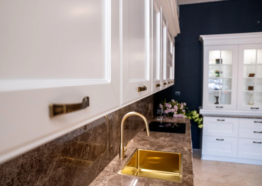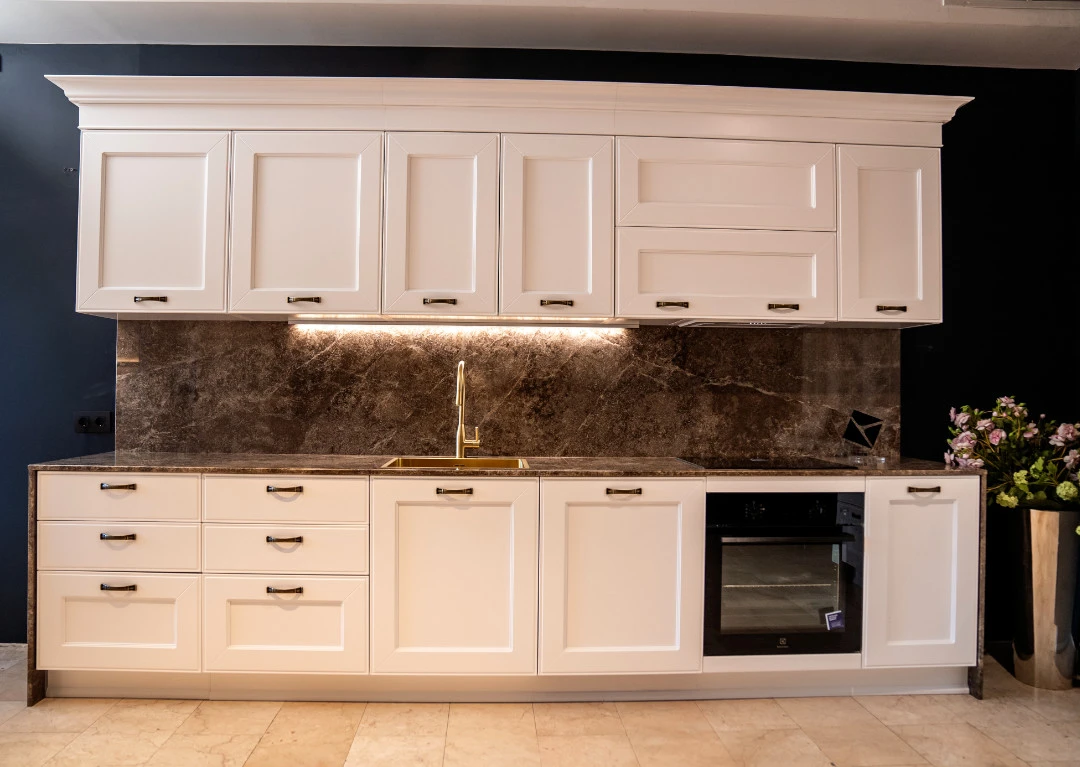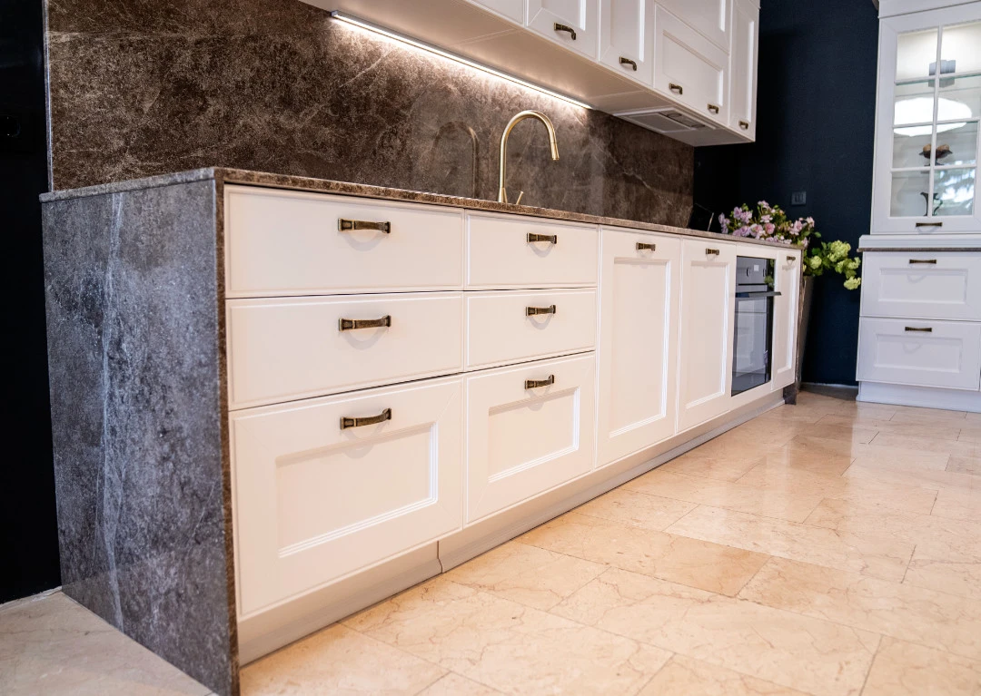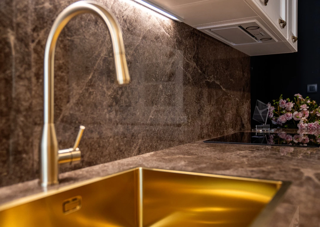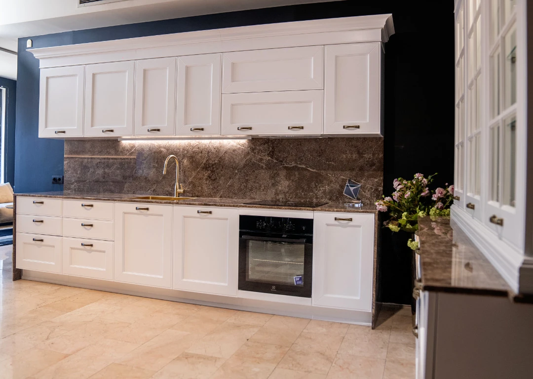 Работните плотове и гърбът между долни и горни шкафове на кухненската композиция са естествен мрамор Emperador.
