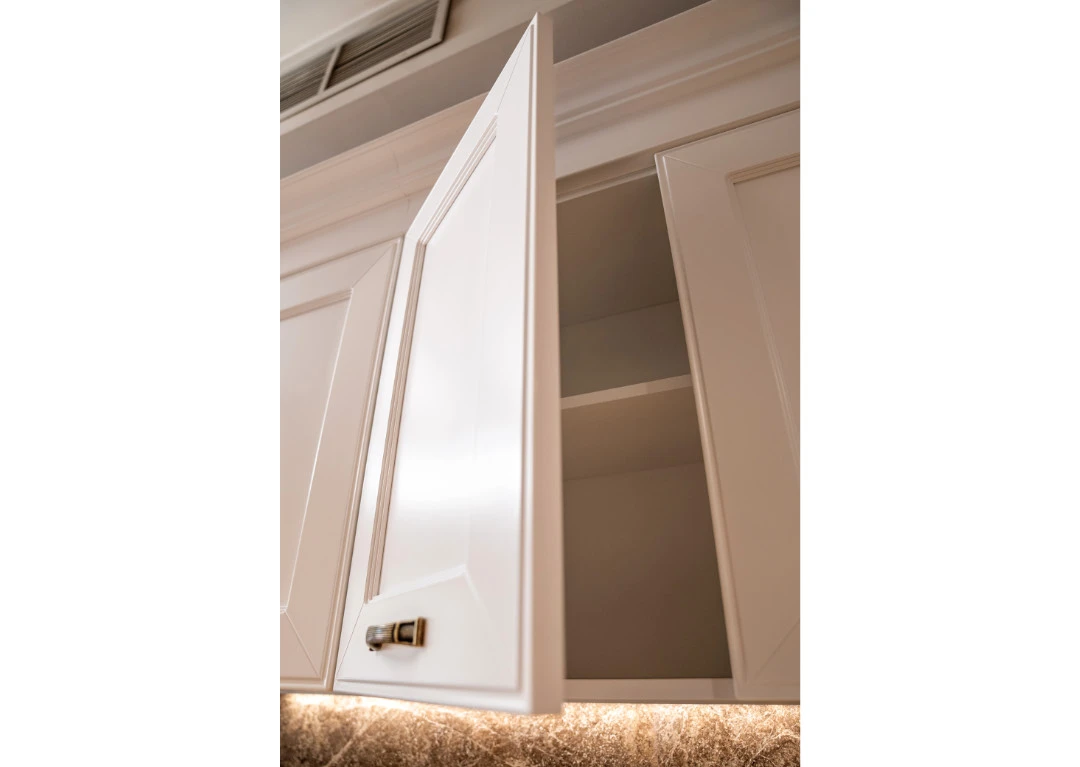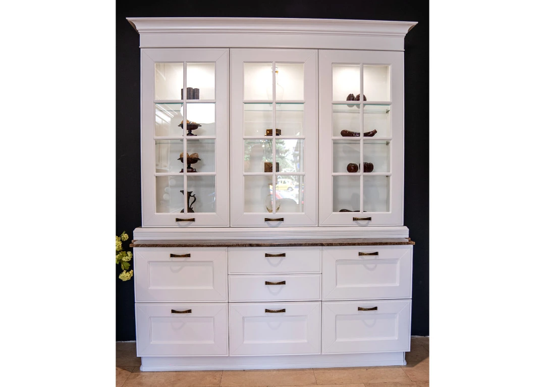 Вратите и чекмеджетата на цялата композиция са с дебелина 24 мм с рамка от масивна липова дървесина, двойно фурнирована с фурнир от череша в мат лак и вътрешен панел от МДФ, фурнирован с череша в мат лак, цвят бял. В конфигурацията има също и витринен шкаф с врати от стъкло в дървена рамка с вградено LED осветление. Металните дръжки в бронзов финиш и декоративните корнизи придават изтънченост, докато внасят уют в пространството. Дървеният цокъл на кухнята е с височина 12 см. LED осветление под горни шкафове.