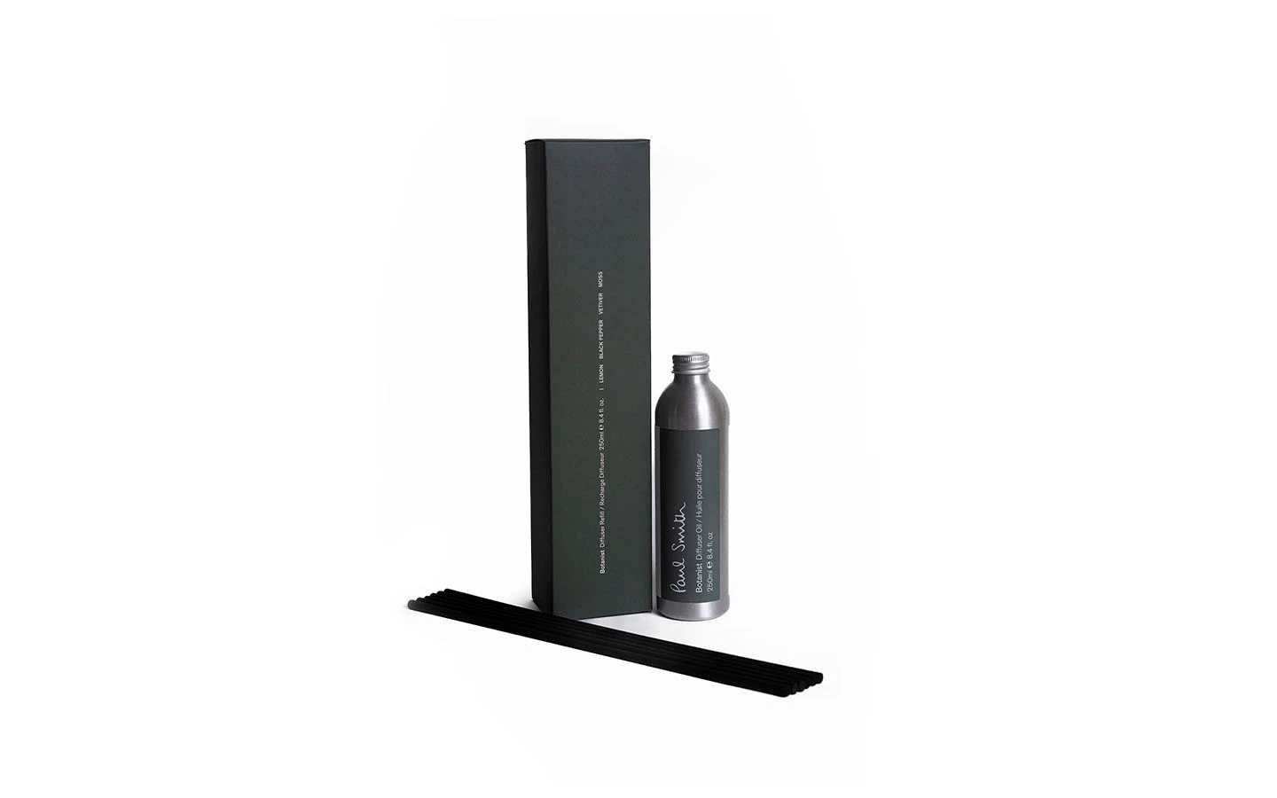 Комплектът включва течност за освежаване на аромата и комплект пръчици, осигуряващи пълно обновяване на колекцията аромати за дома на Paul Smith.