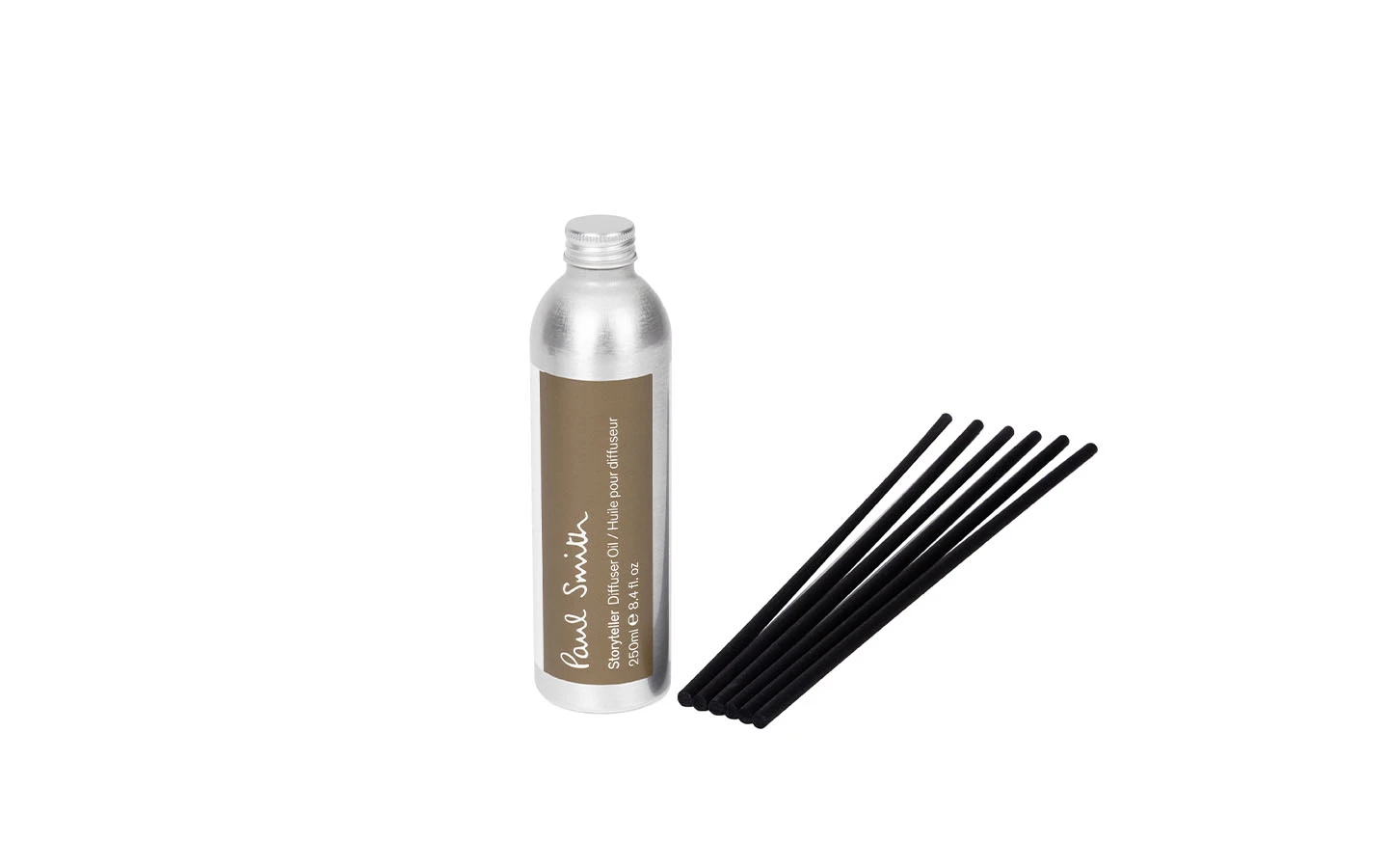 Комплектът включва течност за освежаване на аромата и комплект пръчици, осигуряващи пълно обновяване на колекцията аромати за дома на Paul Smith.