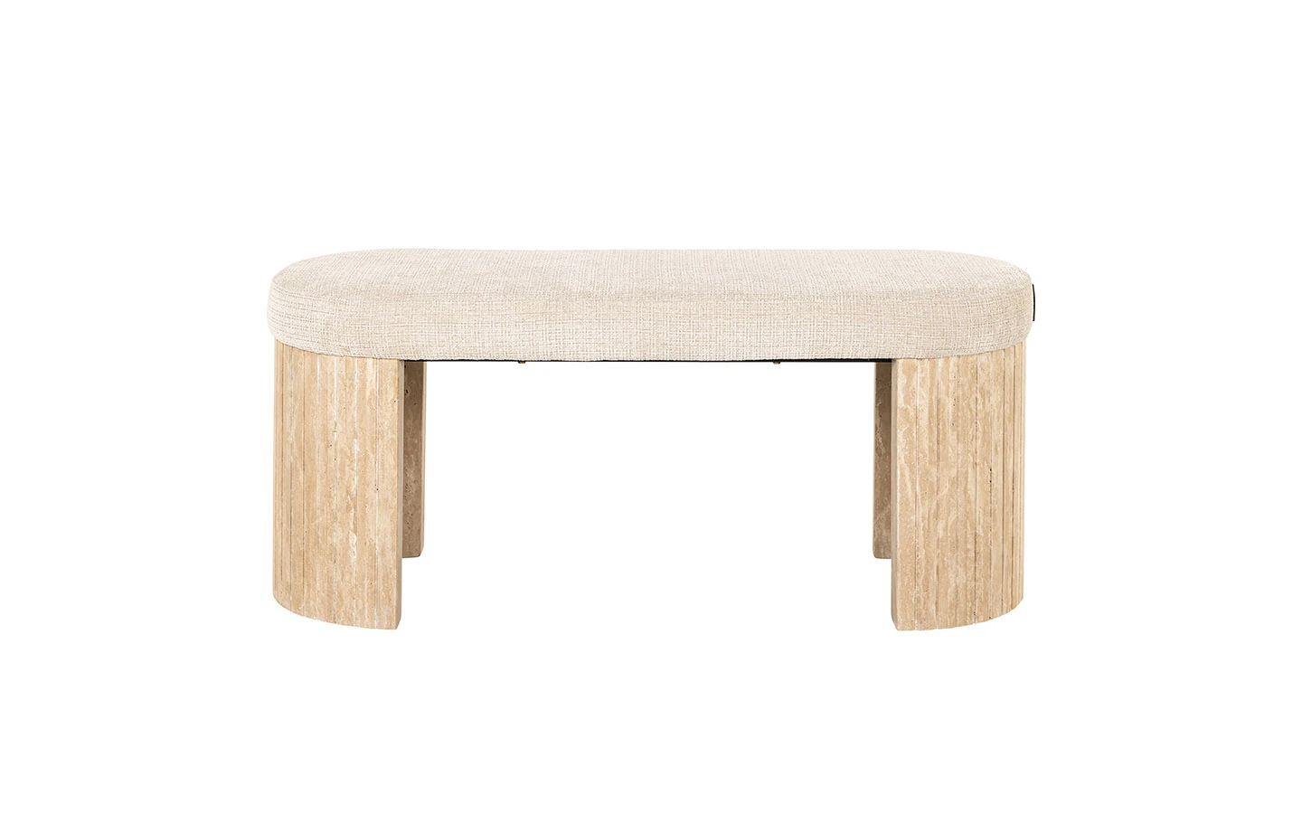 GALLICE е пейка от колекцията на нидерландския производител Richmond Interiors. Основата е изработена от естествен мрамор Travertine. Пейката е тапицирана в дамаска – Natural Beige.