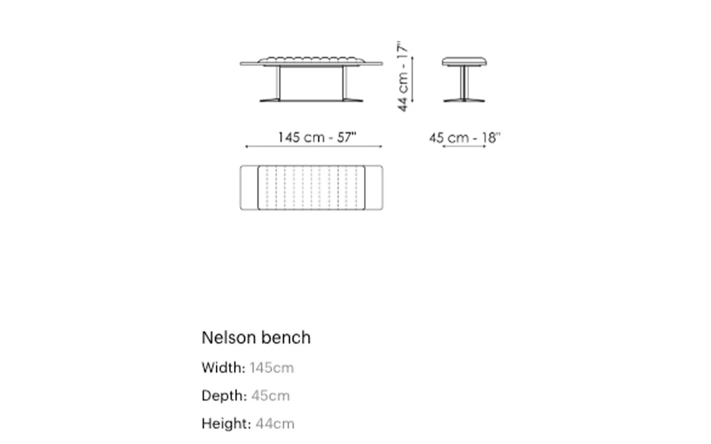 NELSON е италианска пейка от колекцията на италианския производител Bonaldo. Италианската пейка NELSON може да бъде тапицирана в дамаска или еко кожа – цвят по избор на клиента. Седалката е изработена от фурнировано дърво – Canaletto walnut. Краката са изработени от метал – финиш Bronze. Цената на пейката се формира на база на избора на тапицерия. NELSON BENCH е с размери см. 145/45/44H.