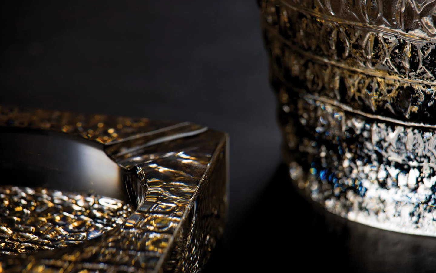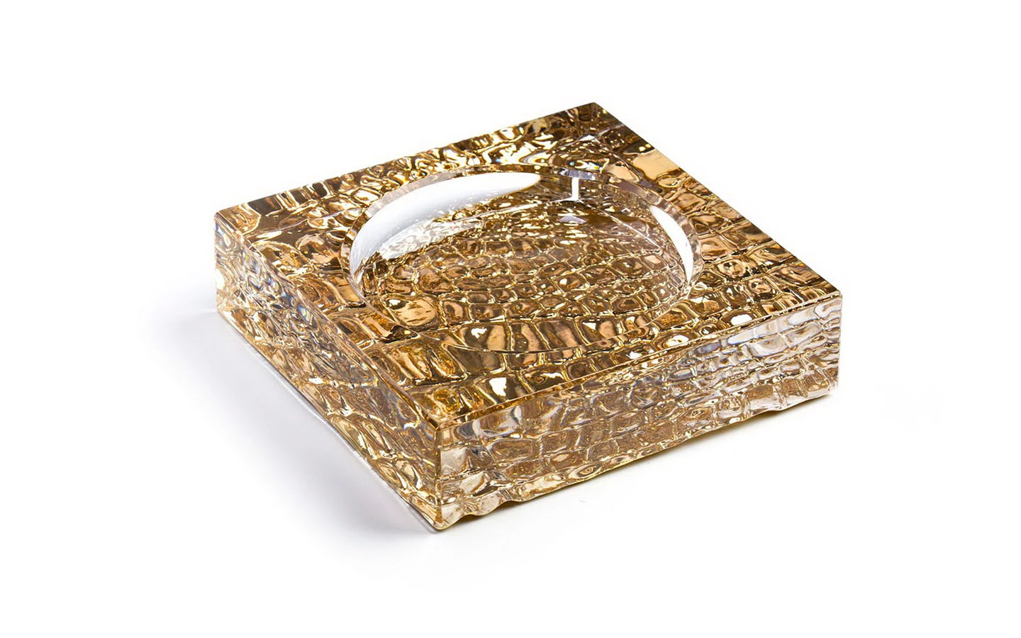Пепелник от колекцията Crocodile Gold на Roberto Cavalli Home Luxury Tableware. Изработен е от оловен бляскав кристал и е с дизайн, вдъхновен от крокодилската кожа, обгърнат в златисто покритие.