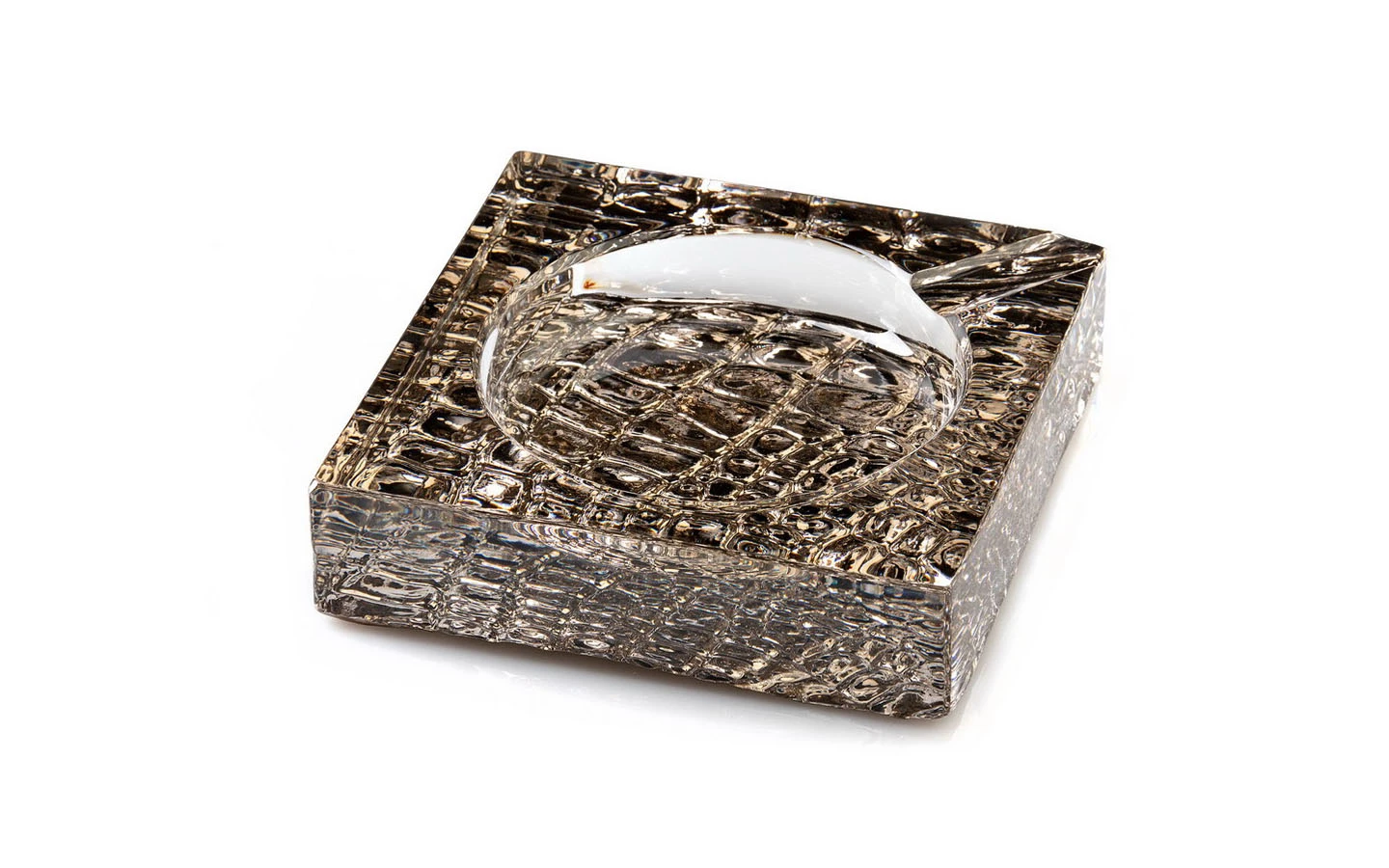Пепелник от колекцията Crocodile Platin на Roberto Cavalli Home Luxury Tableware. Изработен е от оловен бляскав кристал и е с дизайн, вдъхновен от крокодилската кожа, обгърнат в платинено покритие.