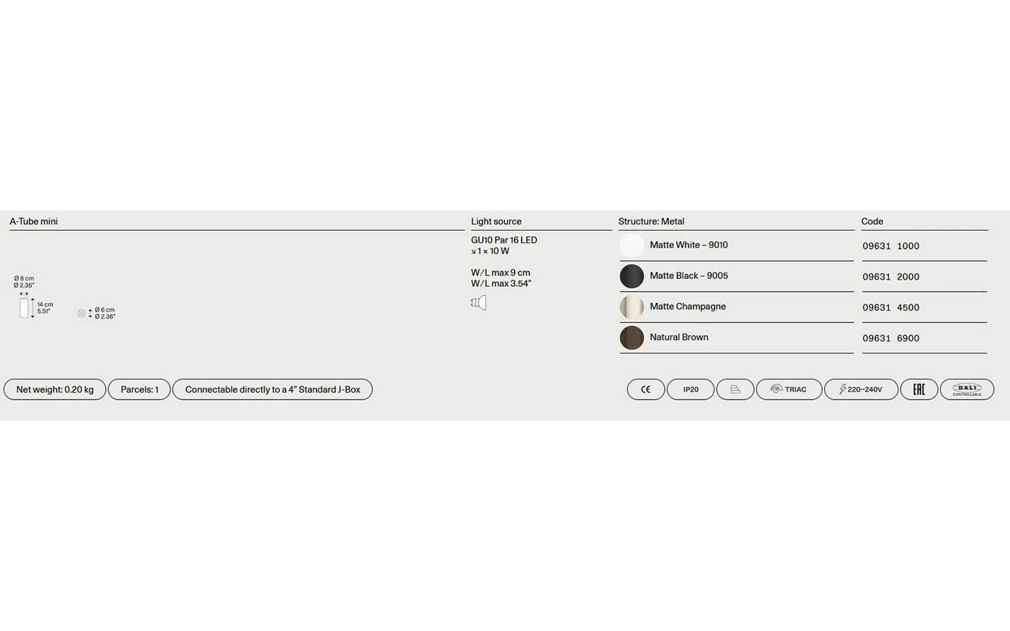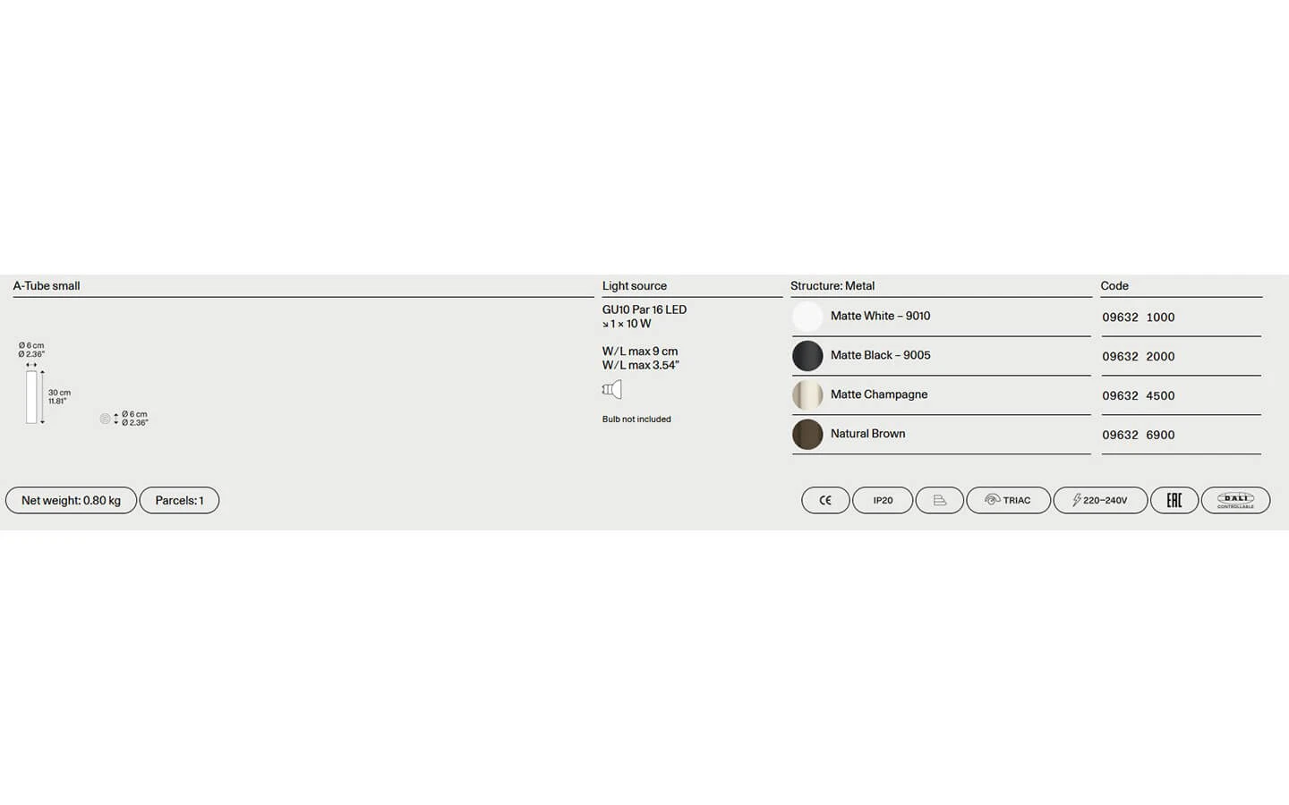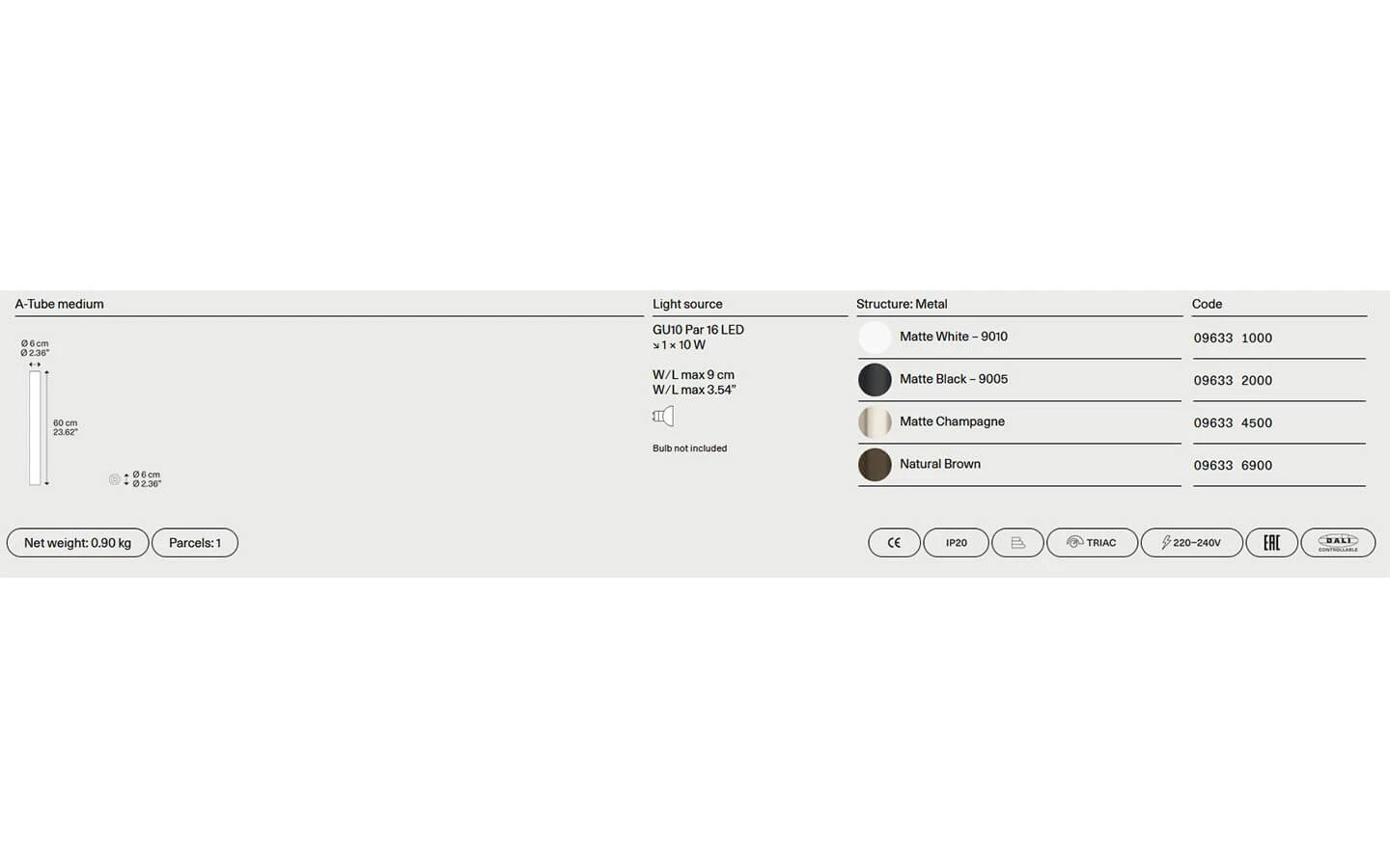 A-TUBE на LODES е елегантен плафон с изчистена цилиндрична форма, който впечатлява с минималистичен, архитектурен характер и прецизно насочена светлина. Дизайнът е редуциран до своята най-чиста геометрия – тънко метално тяло с издължен силует, монтирано директно към тавана, което осигурява концентриран светлинен поток надолу. Благодарение на своята изчистена, но силно изразителна форма, този плафон е подходящ за коридори, кухни, дневни или обществени интериори, където се търси съчетание между функционално осветление и съвременна естетика.
