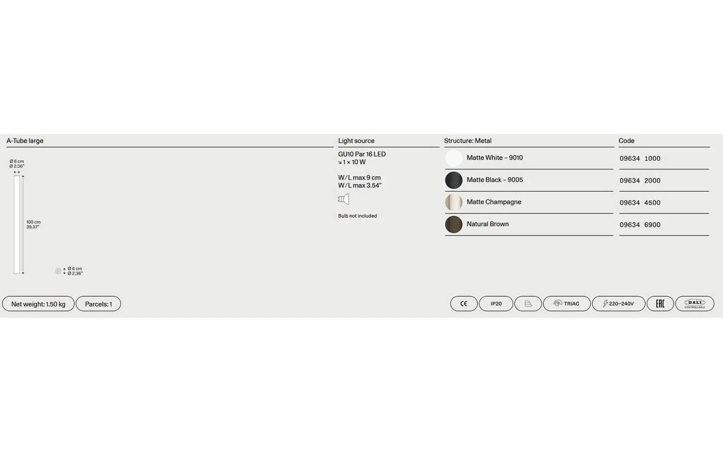 Посочената цена е за плафон A–Tube mini в начална категория финиш на метала за структурата.