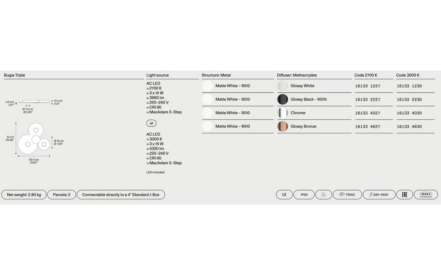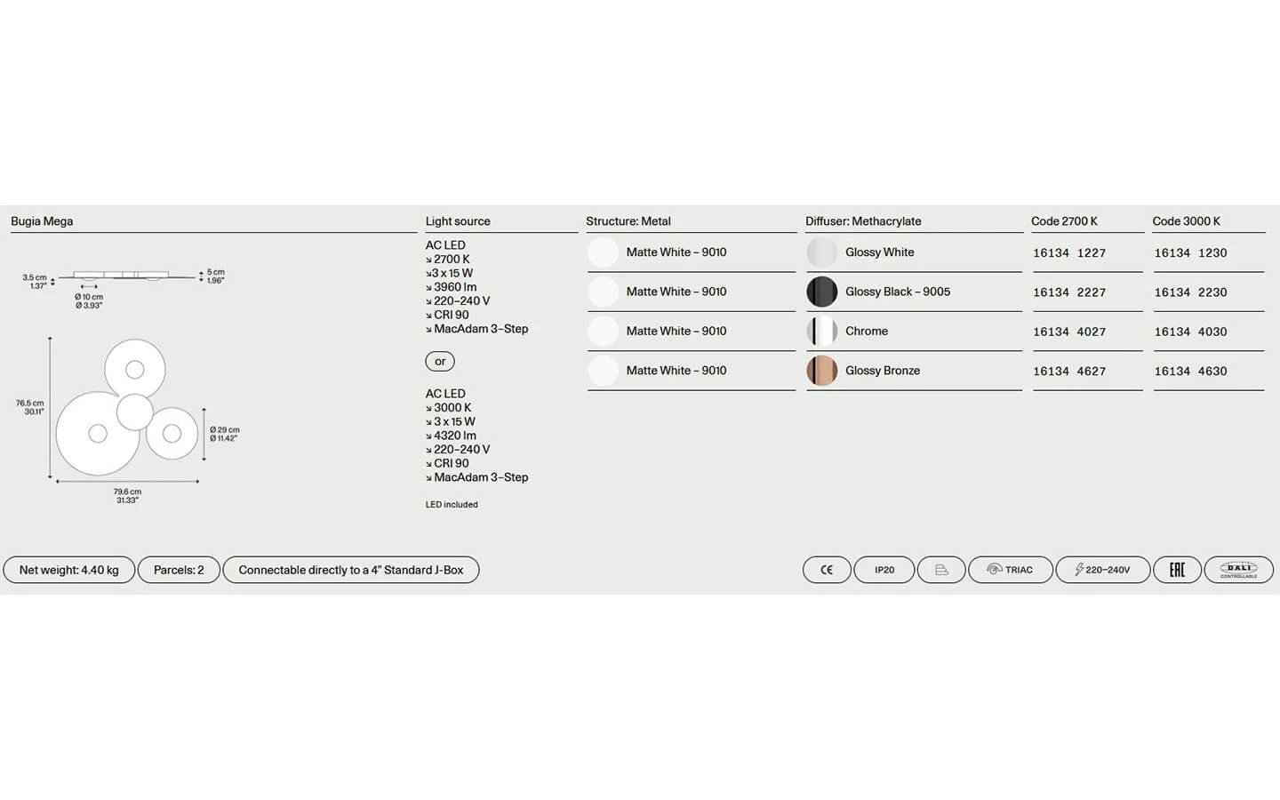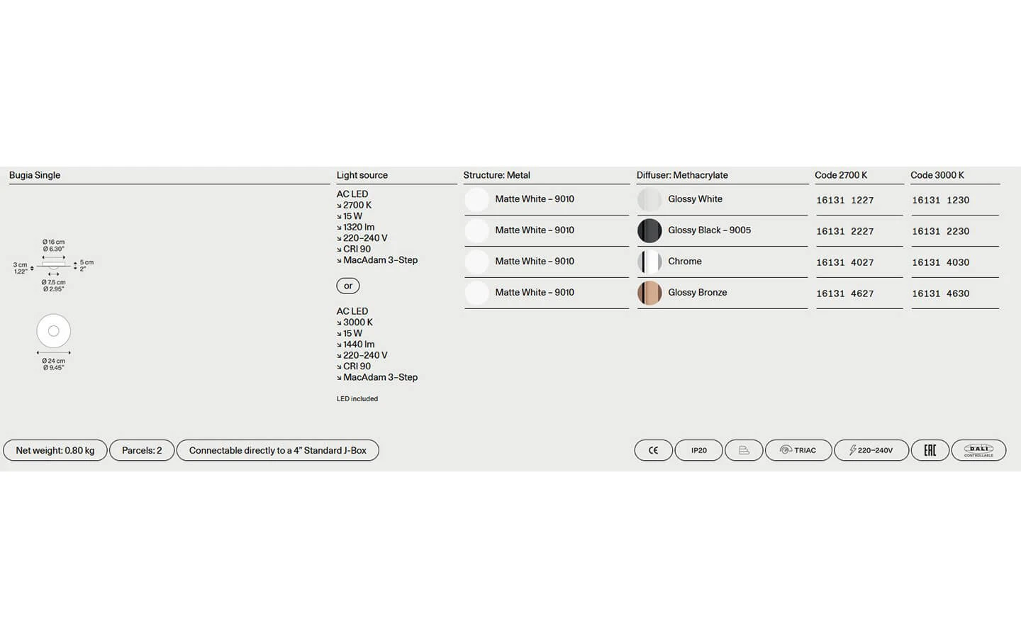 BUGIA е плафон от колекцията на италианския производител LODES. Структурата е изработена от метал – финиш Matte White. Дифузерът е изработен от метакрилат – финиш по избор. Цената се определя спрямо избора на размер.