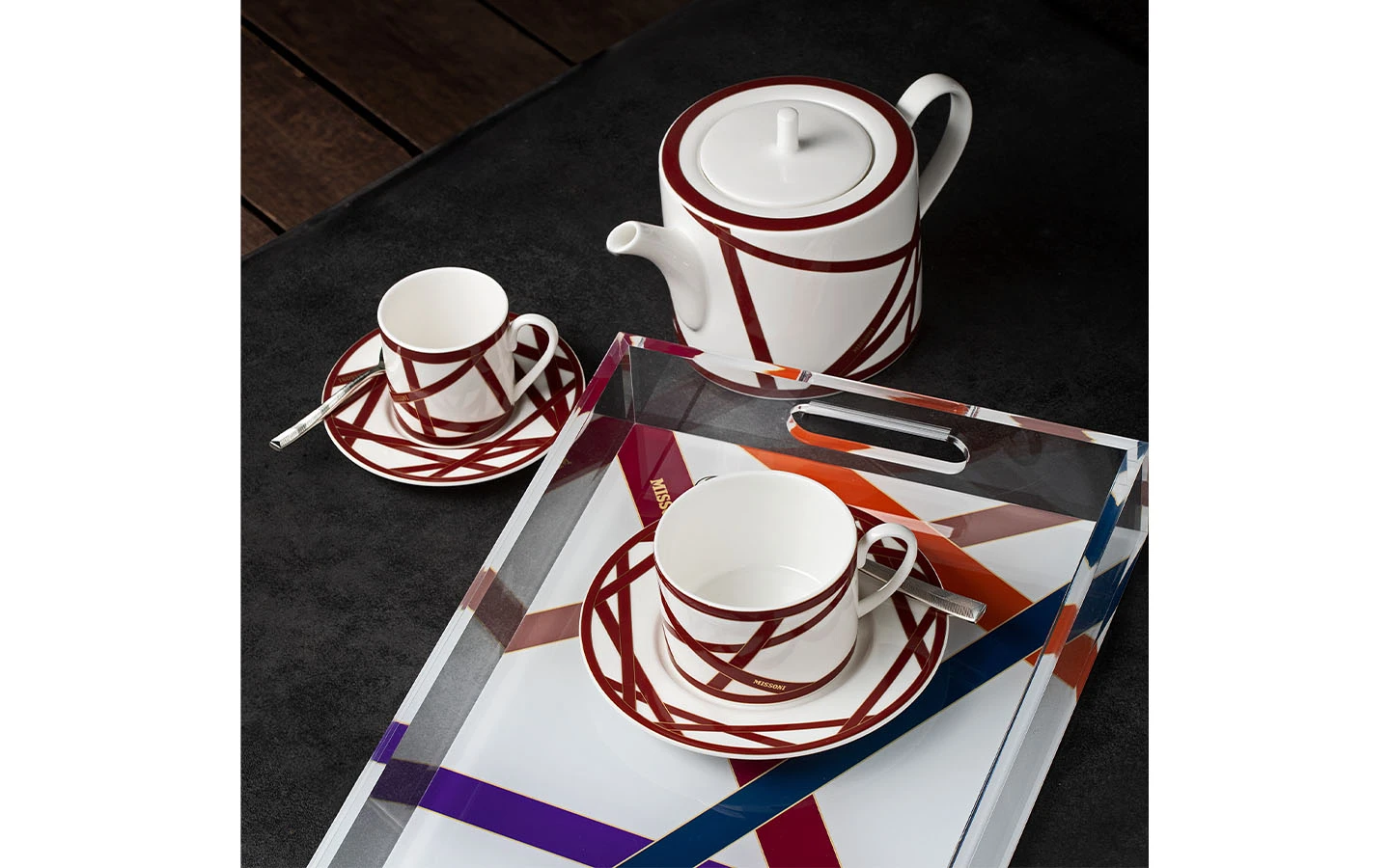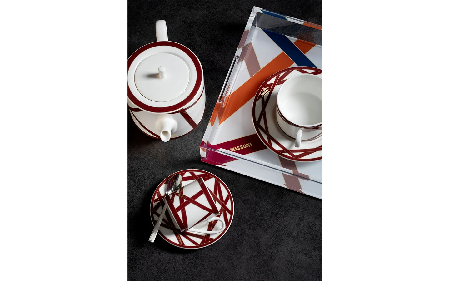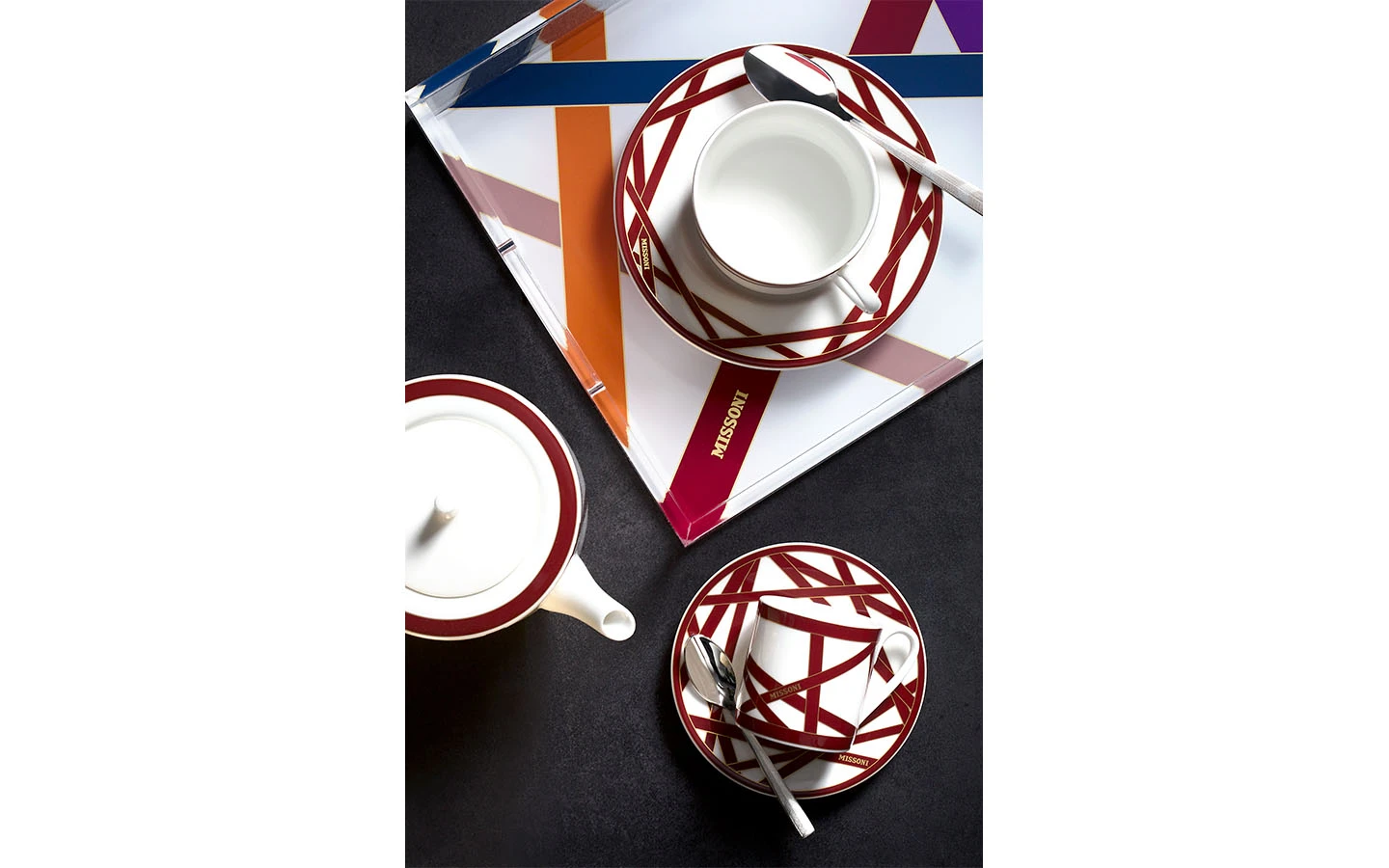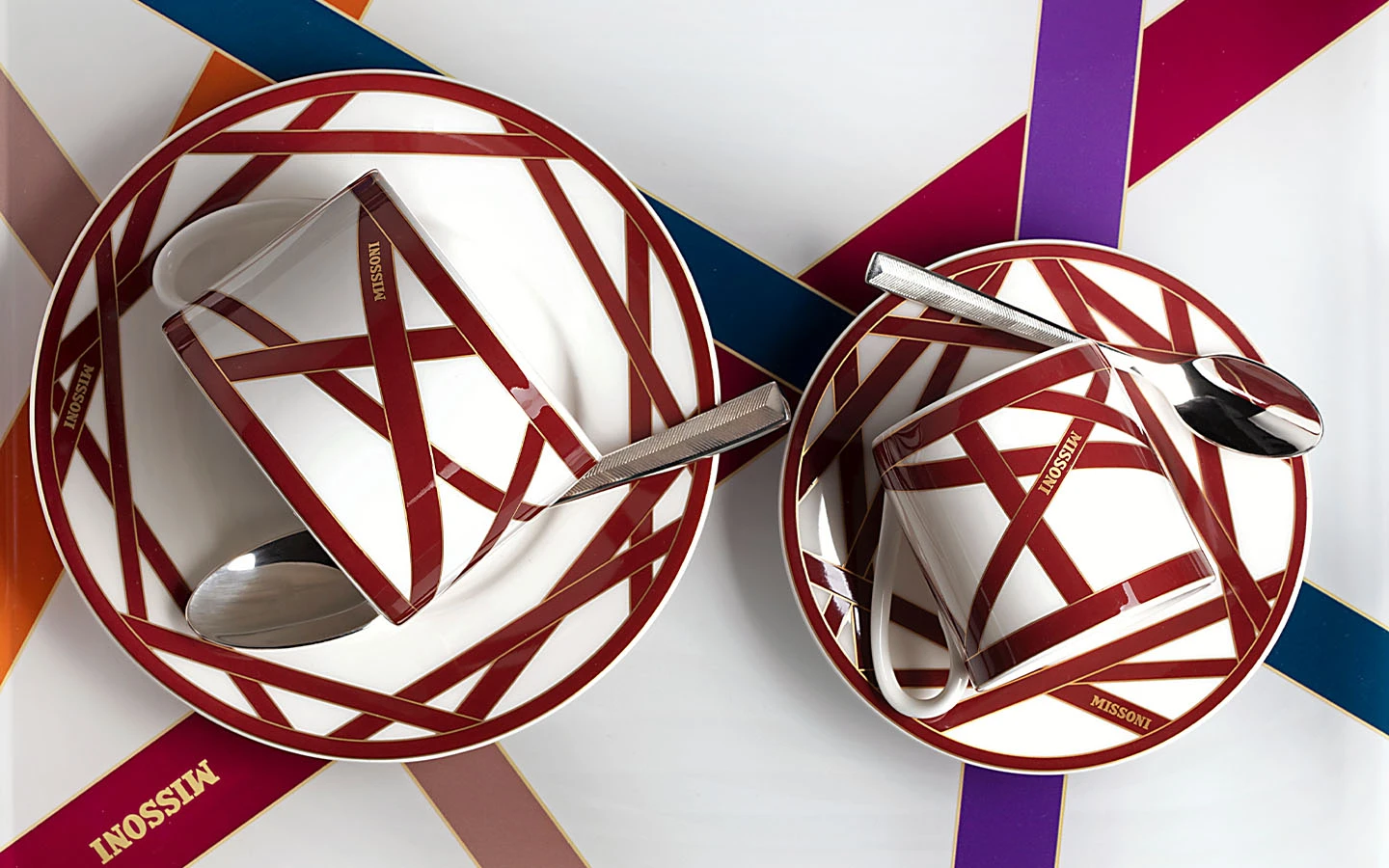 Подаръчен комплект за кафе, Сет от 12 части от колекцията Nastri Bordeaux на Missoni Home. Колекцията се характеризира с хармония, класика и елегантност. Монохромната декорация в цвят бордо е украсена със златен контур, който подчертава нейната красота. 100% фин костен порцелан.