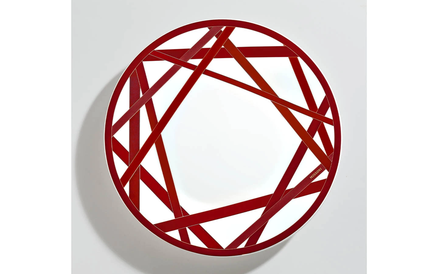 Подложна чиния 32 см от колекцията Nastri Bordeaux от Missoni Home. Колекцията се характеризира с хармония, класика и елегантност. Монохромната декорация в цвят бордо е украсена със златен контур, който подчертава нейната красота. 100% фин костен порцелан.