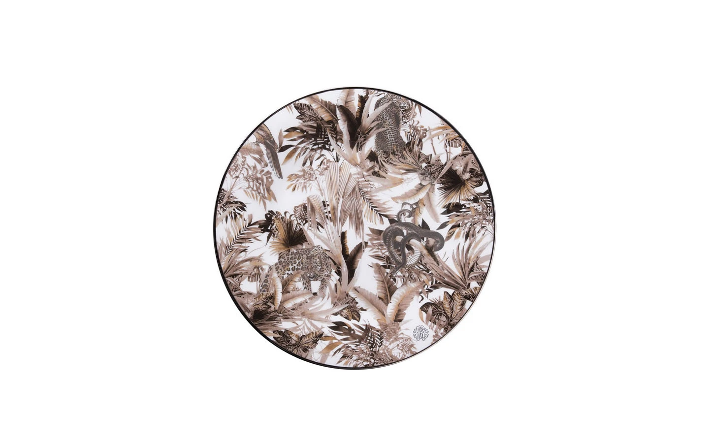 Подложна чиния от колекцията Tropical Jungle White от Roberto Cavalli Home. Луксозната чиния Tropical Jungle White е изработена от 100% фин костен порцелан с дизайн на джунгла с тропически листа, животински принт, характерна змия и платинен кант.