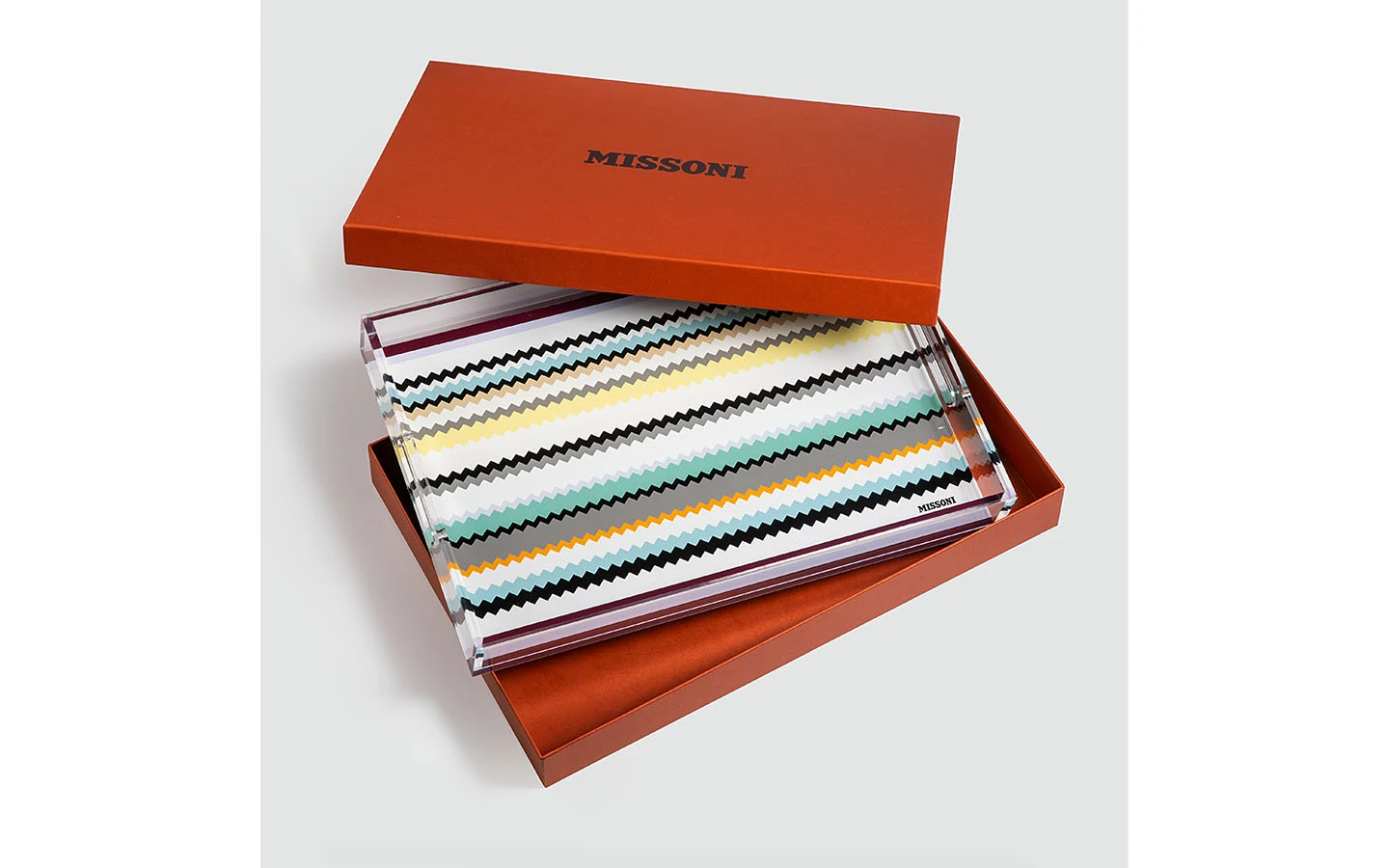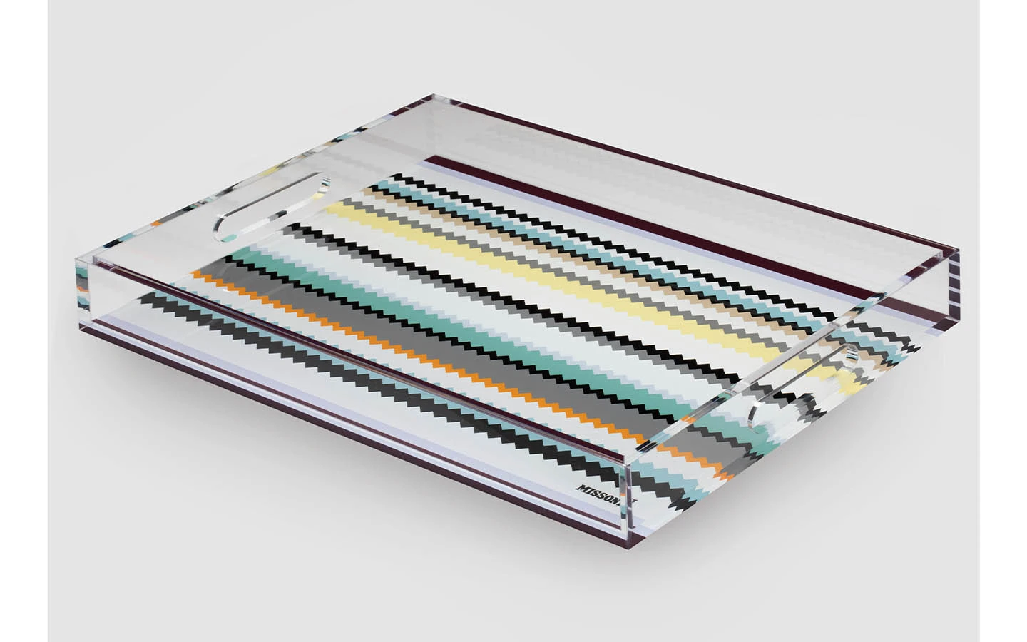 Поднос Large от колекцията Curt на Missoni Home. Подносът е с правоъгълна форма и прозрачен дизайн с многоцветен зиг заг мотив, характерен за Missoni.