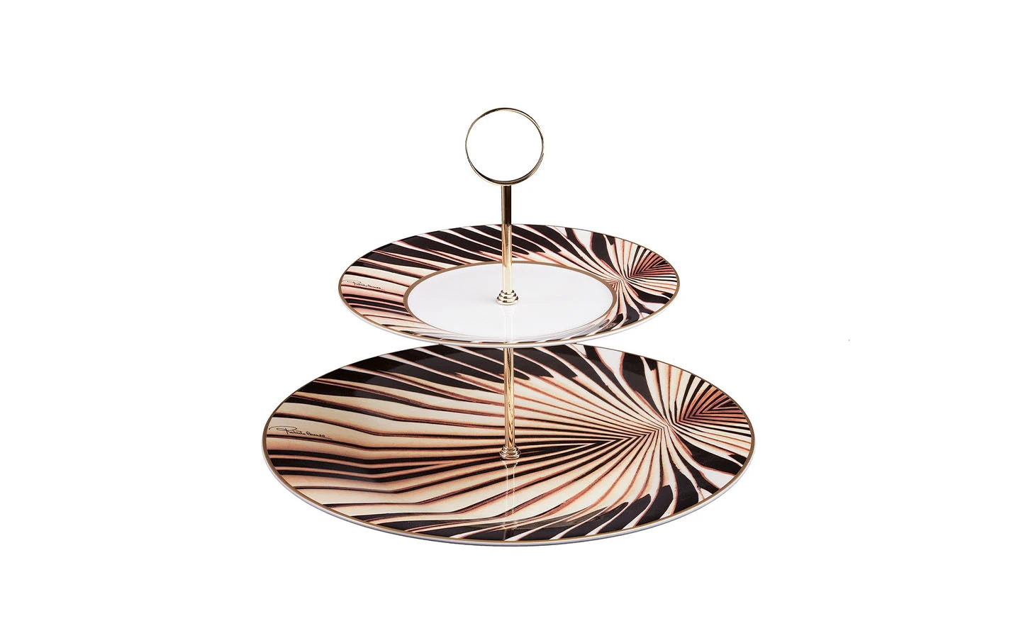 Поднос на две нива от колекцията Palazzo Pitti Platin от Roberto Cavalli Home. Palazzo Pitti е зашеметяващ абстрактен дизайн, съчетаващ леопардов принт с традиционен син мотив.