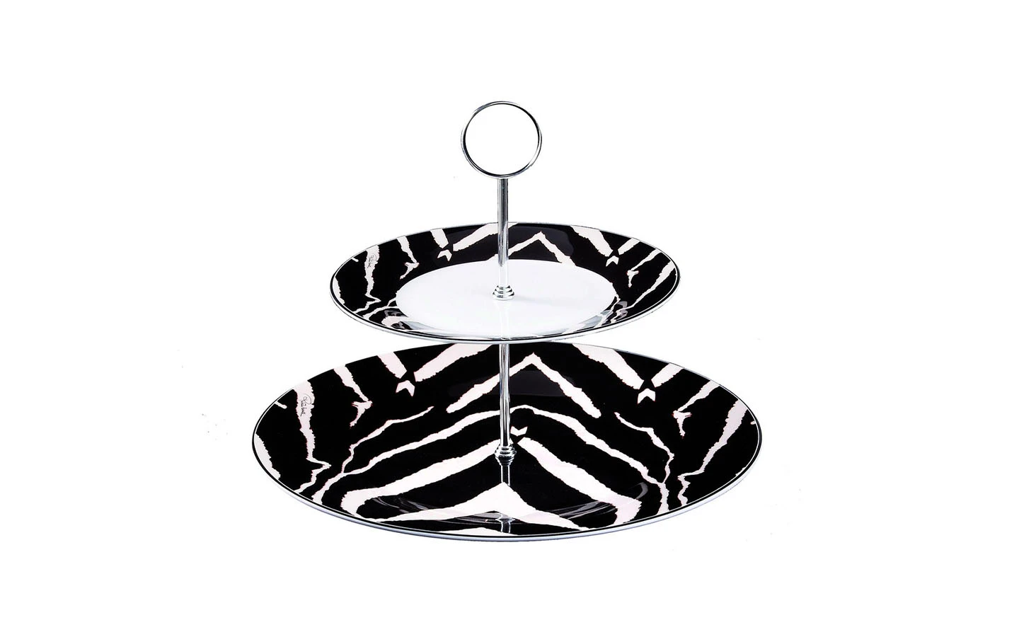 Поднос на две нива от колекцията Zebra от Roberto Cavalli Home. Луксозната серия Zebra представя емблематичен дизайн на Roberto Cavalli. 100% фин костен порцелан с Zebra дизайн и платитен кант.