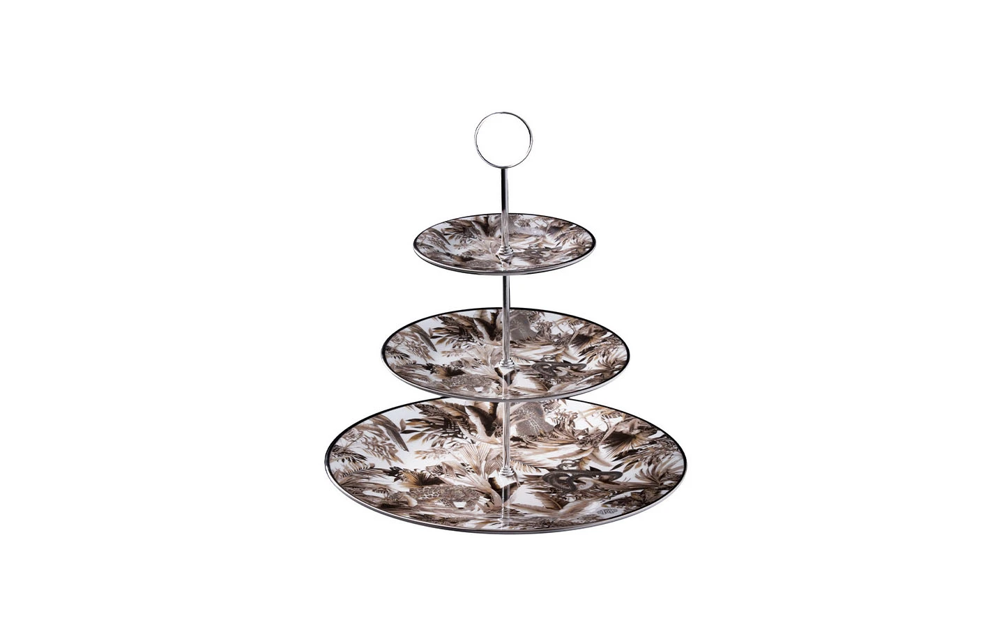Поднос на три нива от колекцията Tropical Jungle White от Roberto Cavalli Home. Луксозната серия Tropical Jungle White е изработена от 100% фин костен порцелан с дизайн на джунгла с тропически листа, животински принт, характерна змия и платинен кант.