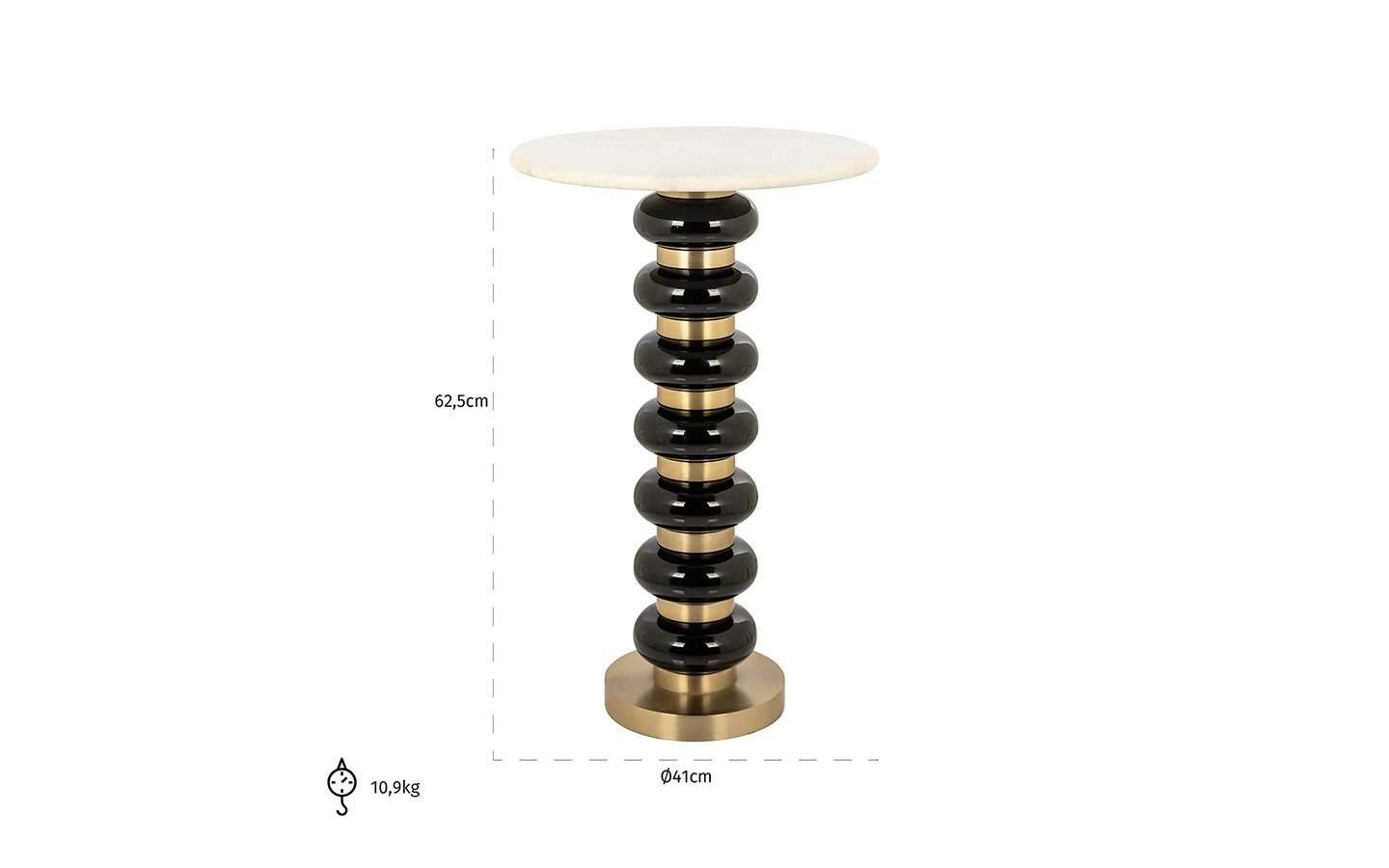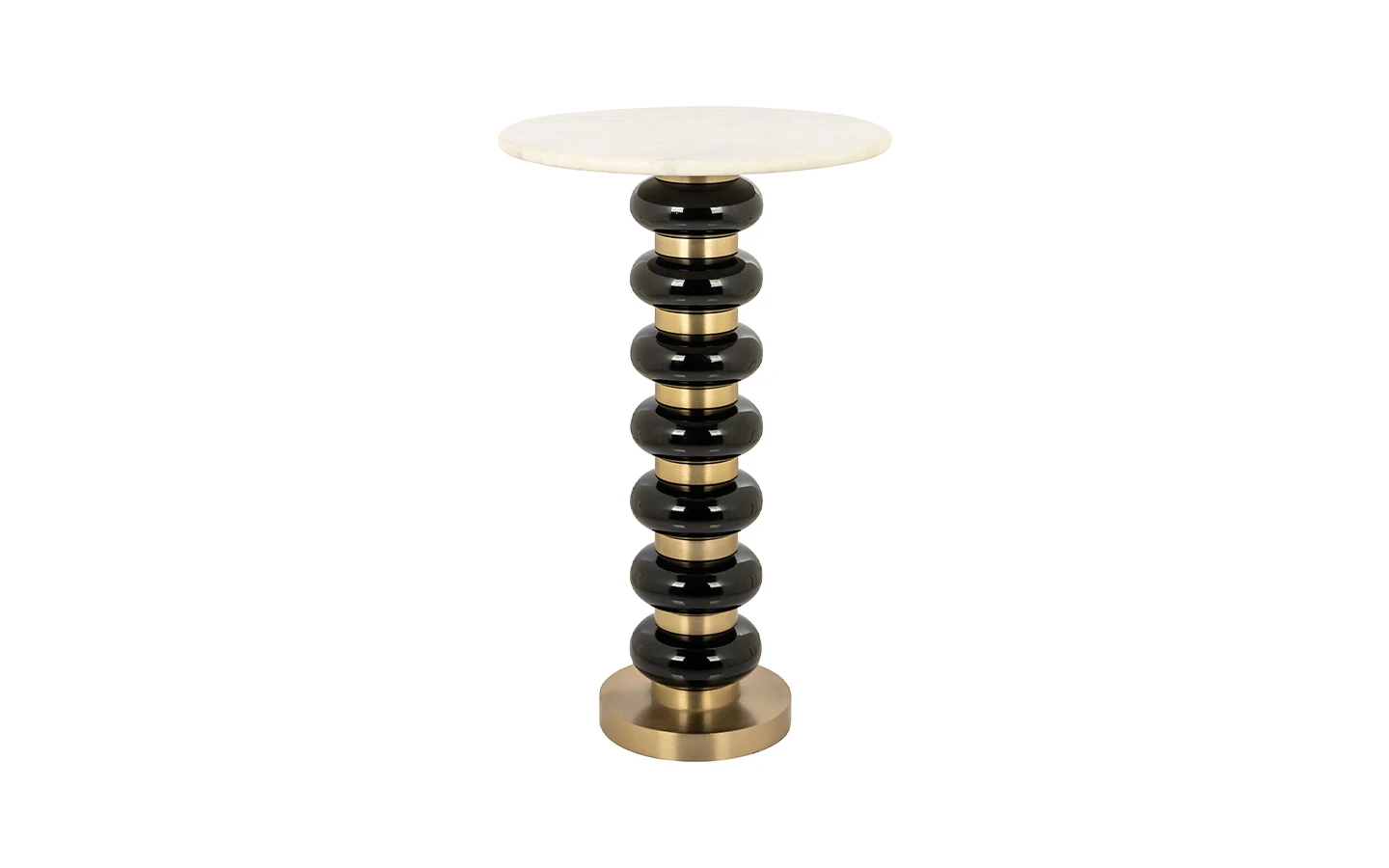 Помощната маса BARBARA BLACK на Richmond Interiors, е изискано съчетание на съвременен дизайн и луксозна естетика. Със своята скулптурна форма и контрастни материали, тя придава елегантен акцент на всяко пространство. Масата се отличава с кръгъл плот от бял мрамор, който лежи върху основа с редуващи се черни и златисти елементи, създавайки динамичен и модерен вид. Тази комбинация от материали и цветове я прави подходяща както за модерни, така и за класически интериори.