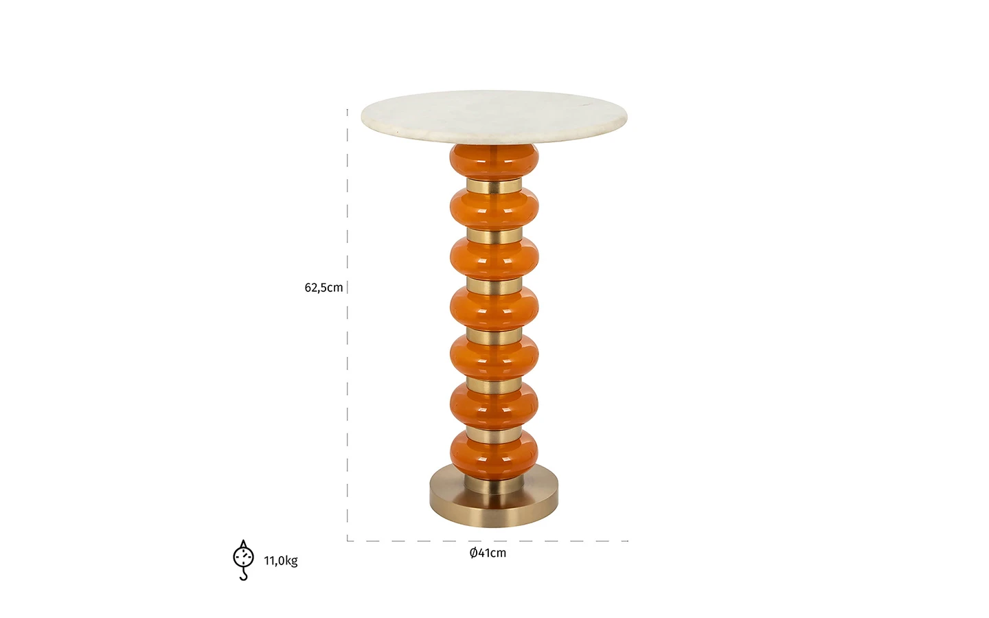 BARBARA ORANGE е помощна маса от колекцията на нидерландския производител Richmond Interiors. Структурата е изработена от алуминий. Плотът на помощната маса е изработен от мрамор – White banswara. Детайли изработени от стъкло – финиш orange.
