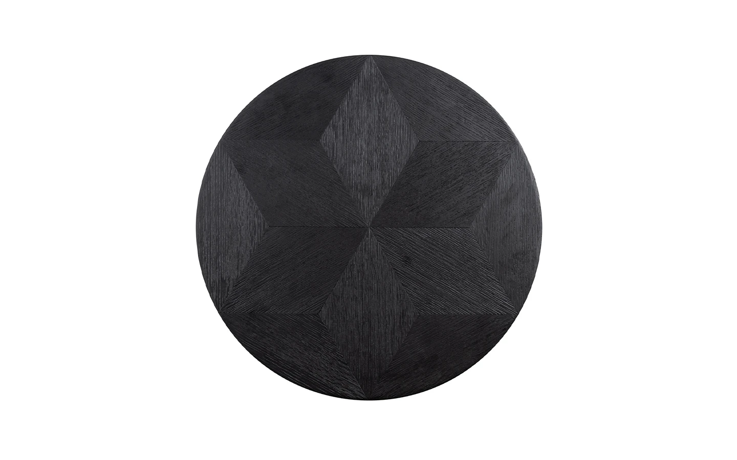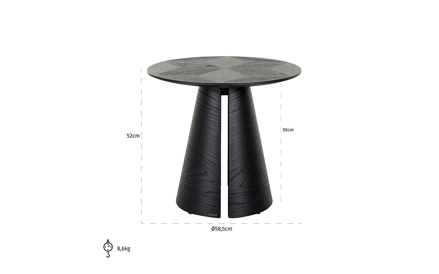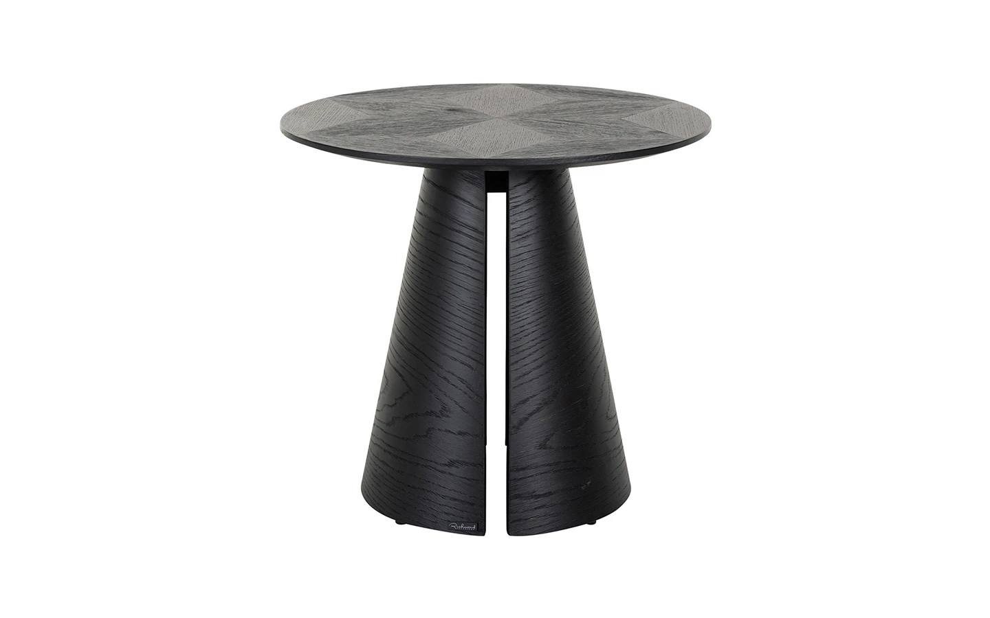 Помощната маса BLAX 58Ø от Richmond Interiors, е елегантно и функционално допълнение към съвременния интериор. Изработена от черен дъбов фурнир, тя впечатлява с конусовидната си основа, която създава интересен визуален ефект чрез линейни изрязвания. Кръглият плот с диаметър 58,5 см и височина 52 см предлага стабилна и стилна повърхност за поставяне на декоративни елементи или ежедневни предмети. Черното покритие подчертава естествената текстура на дървото, придавайки на масата изискан и модерен вид.