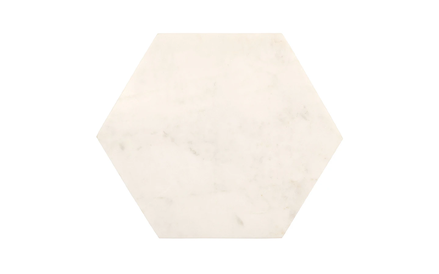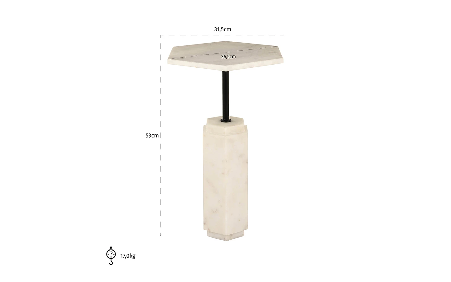 Помощната маса LILITHA на Richmond Interiors, е изискано допълнение към съвременния интериор, съчетаващо геометричен дизайн и висококачествени материали. Масата се отличава с шестоъгълен плот и основа от бял мрамор, свързани чрез елегантна черна метална колона. Този контраст между светлия мрамор и тъмния метал придава на масата съвременна естетика и я прави подходяща както за модерни, така и за класически интериори.