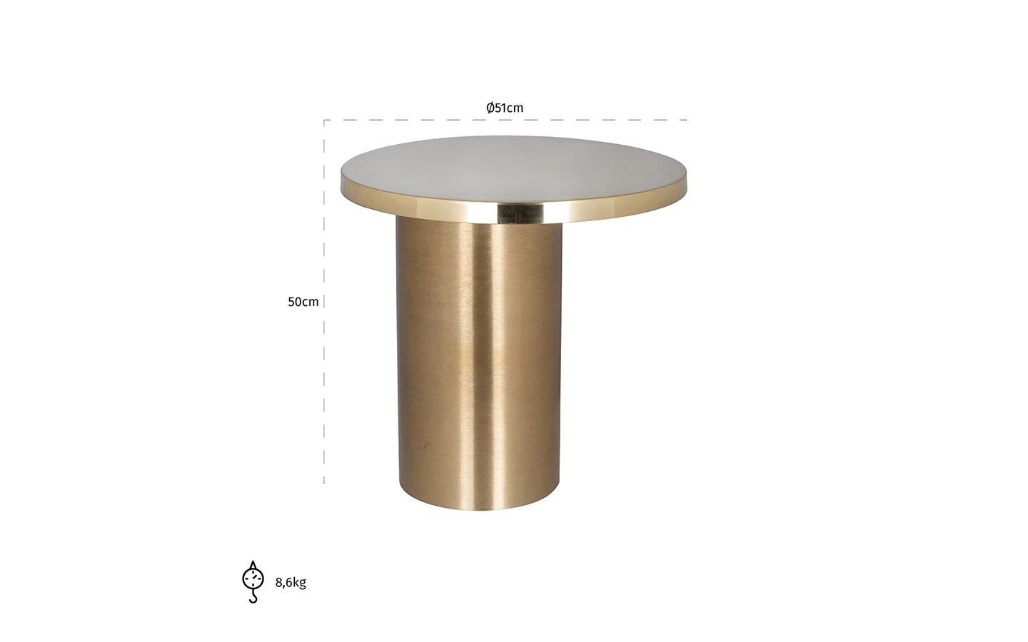 Помощната маса NAYA на Richmond Interiors, е елегантно допълнение към съвременния интериор, съчетаващо минималистичен дизайн с луксозни материали. Масата се отличава с изчистен и модерен дизайн, включващ цилиндрична форма и златно покритие, придаващо усещане за лукс и елегантност. Този дизайн я прави подходяща както за модерни, така и за класически интериори.